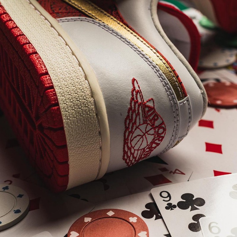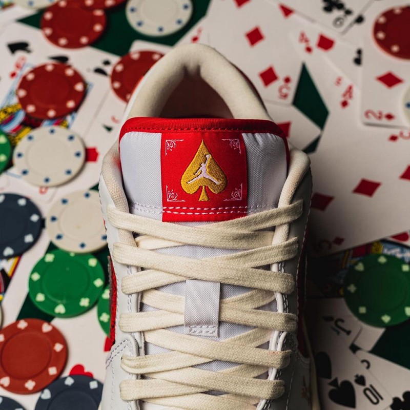 鞋舌处也是一大亮点,在金色的 “黑桃” 图案上印有白色 Jumpman,直击配色主题。
