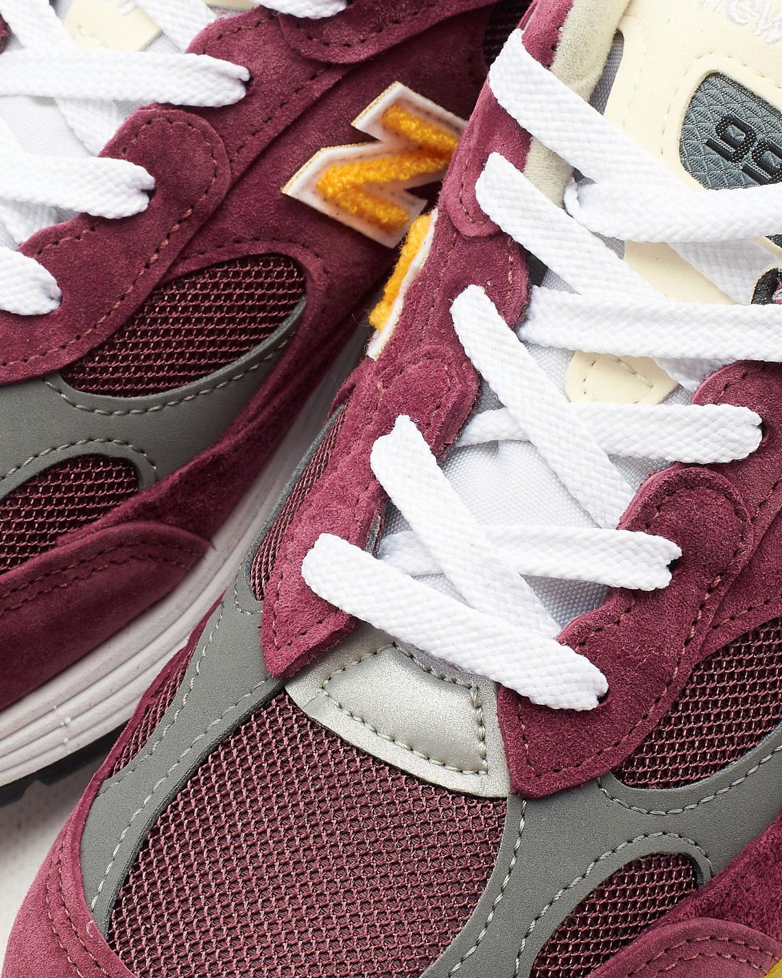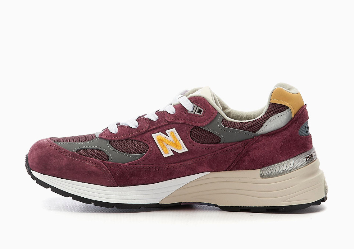 整双鞋的鞋面使用酒红色翻毛皮覆盖,搭配亮黄色的毛巾绒 “N” 字 Logo,在 992 经典复古造型的衬托下,看起来质感格外出众。
