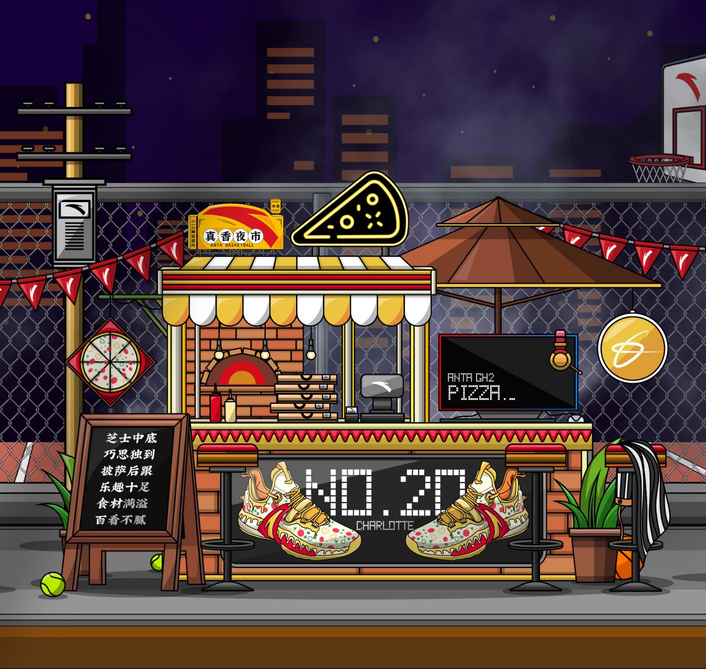 米黄色鞋身上,大面积点缀红、黄、绿色装饰,呈现出披萨表面配料。