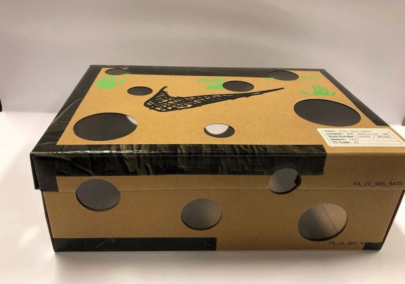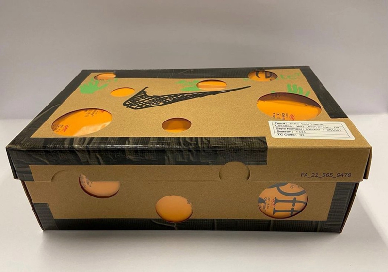 鞋盒造型十分特殊,孔洞的造型与当时 OFF-WHITE 联名的造型大同小异,盖子上画有 OFF-WHITE 新图案,彰显 Virgil 的身份。
