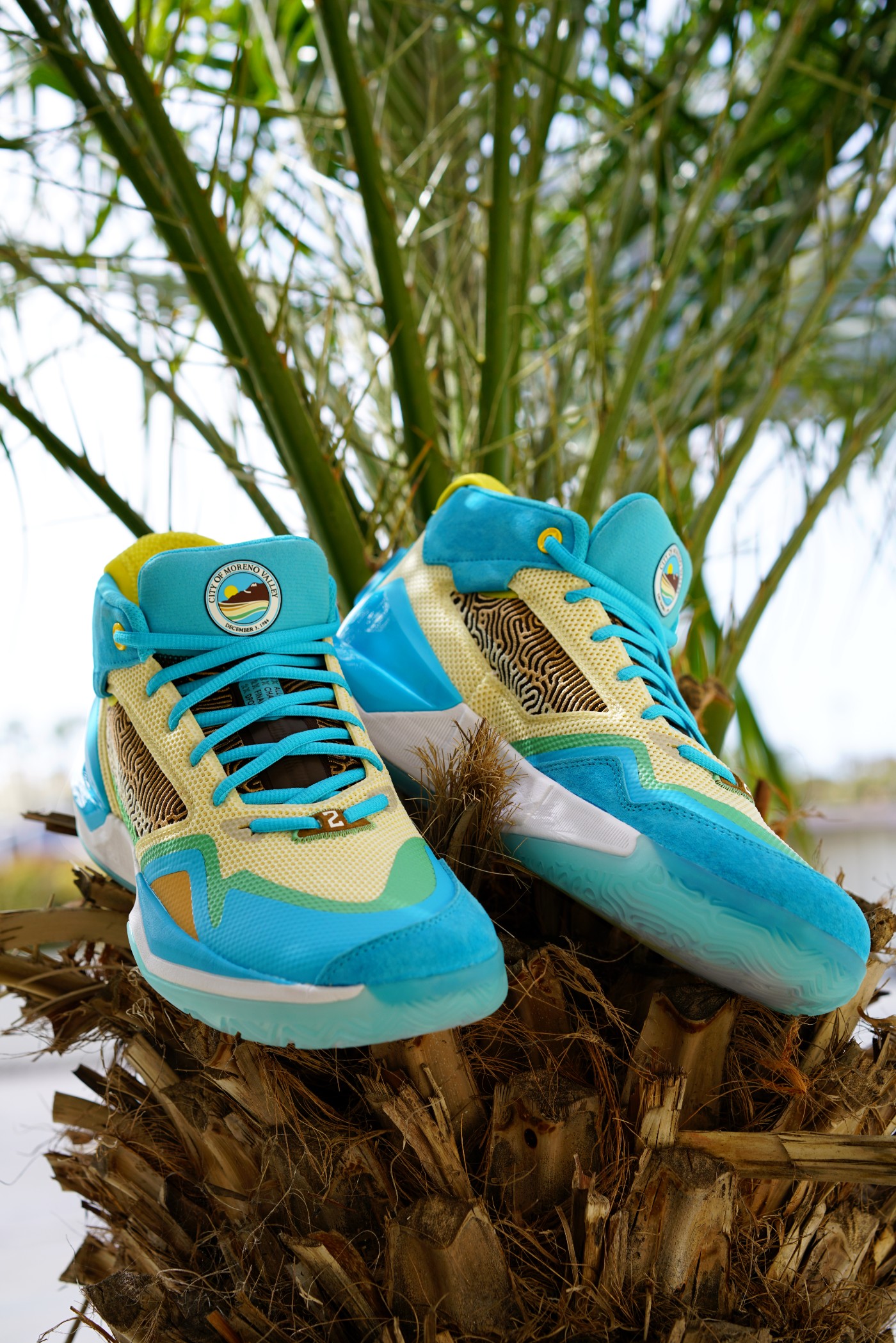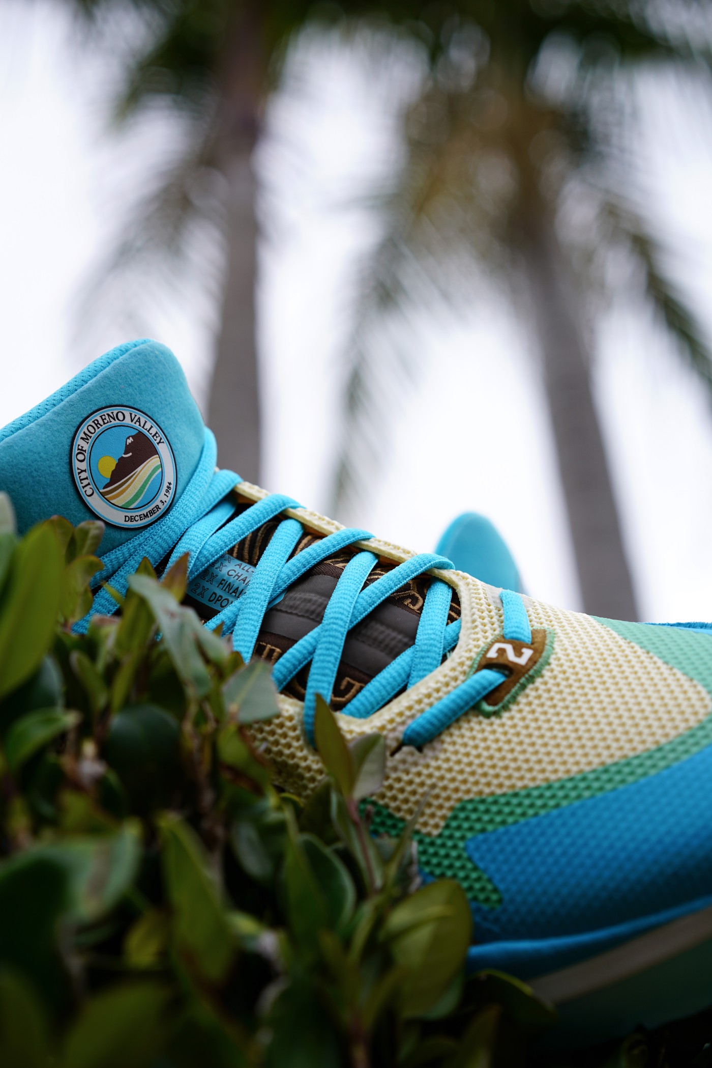 整双鞋呈现黄蓝棕配色,与 “Moreno Valley” 城市官方印章上的配色相同。