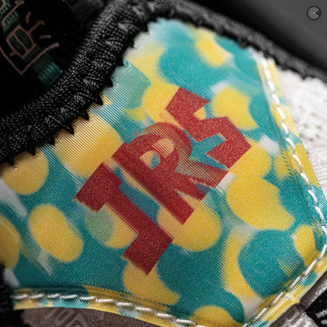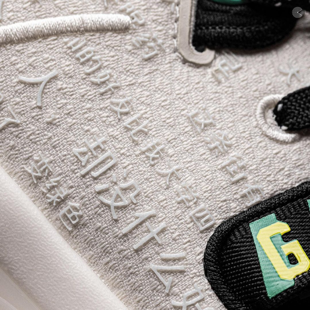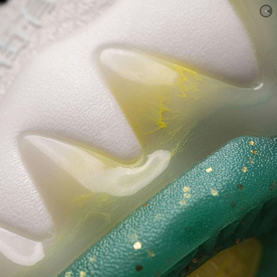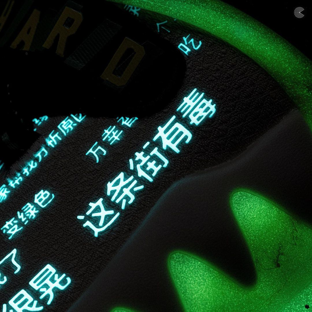 鞋身侧面标志性的虎牙 TPU 采用绿色和金黄色的炫彩设计,同样有夜光效果。