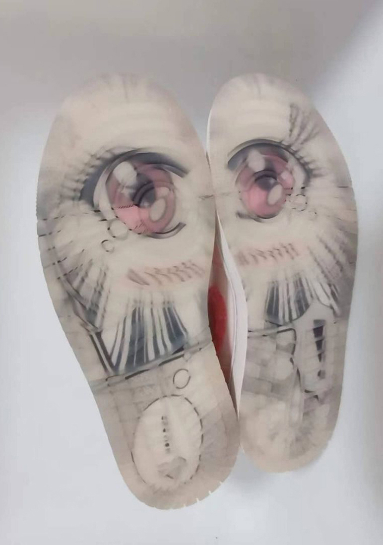 透明的乳白色外底上点缀着一双二次元的大眼睛,水汪汪的造型加上后跟的叹号和爱心造型,仿佛在说着「你舍得穿我吗?」。