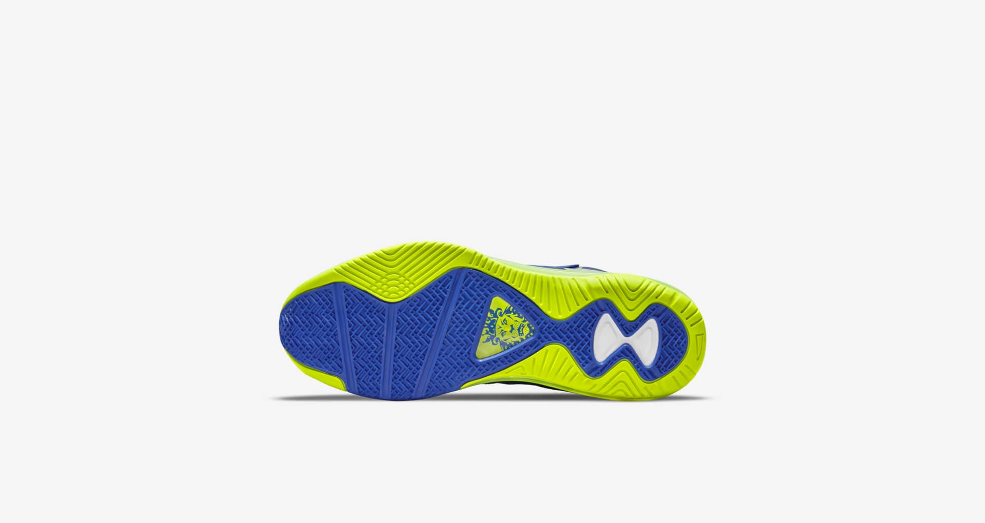 白色 Swoosh Logo 搭配荧光绿线条勾勒,呼应配色主题。