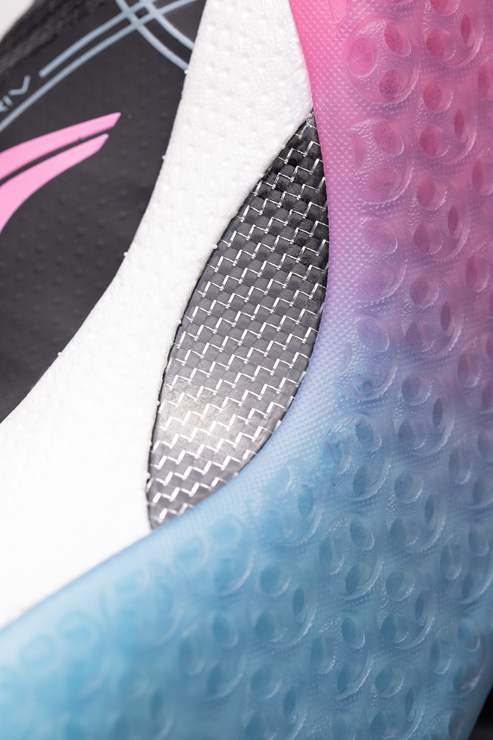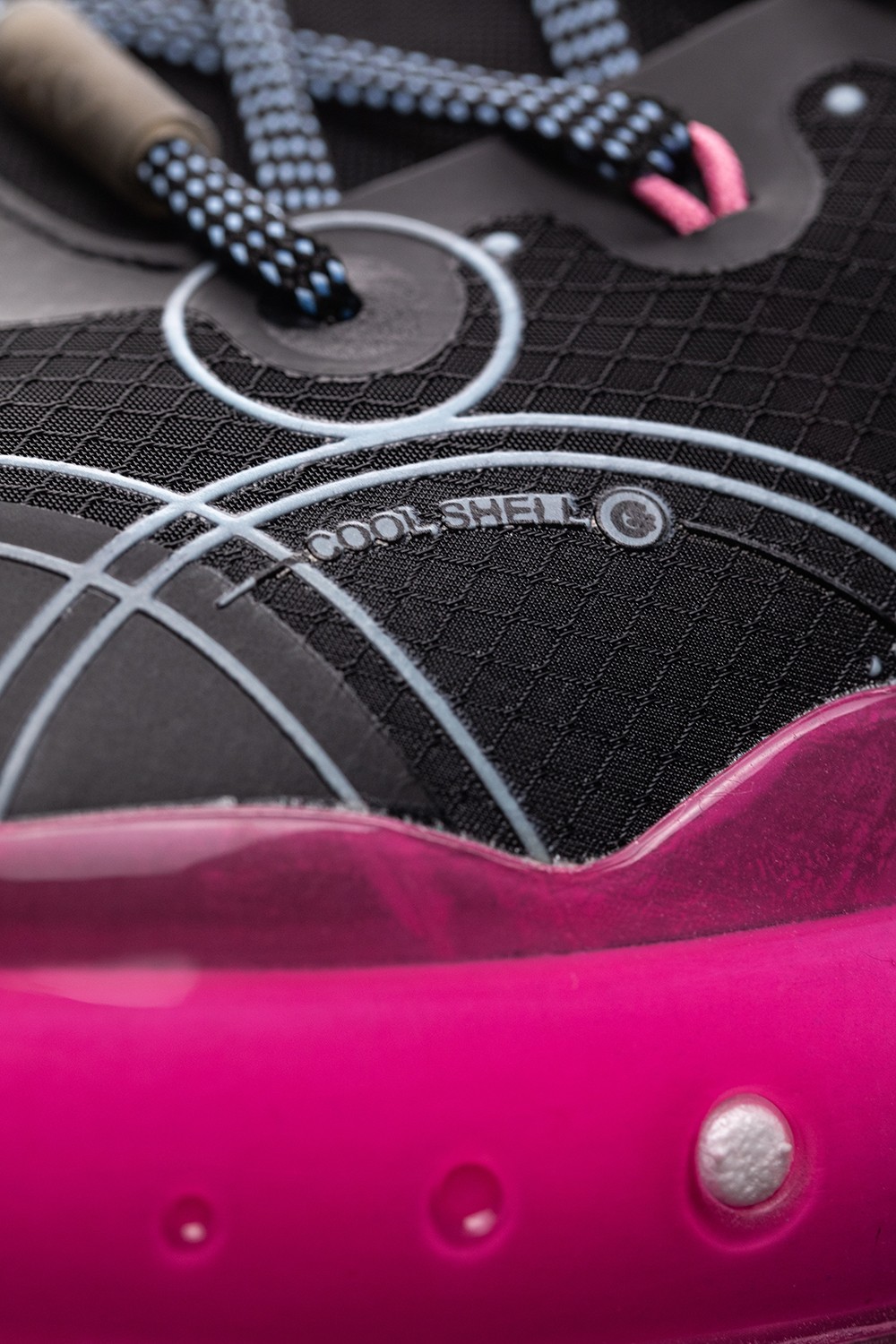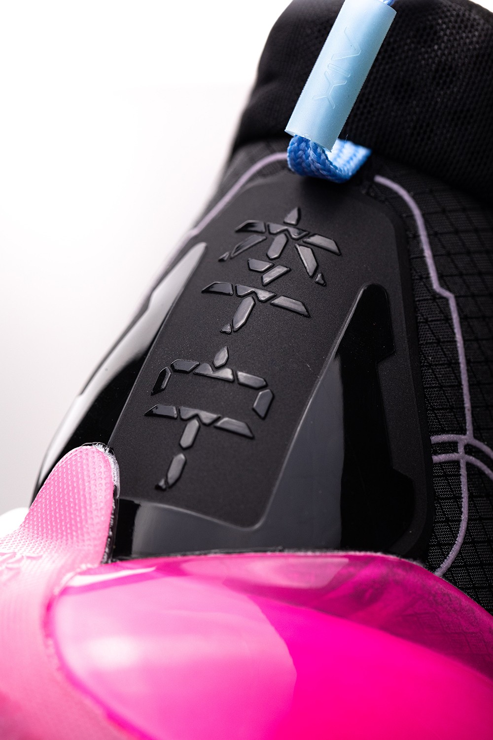 鞋面的弧形纹理、内置飞线、鞋带等细节,均采用粉、蓝鸳鸯的设定。