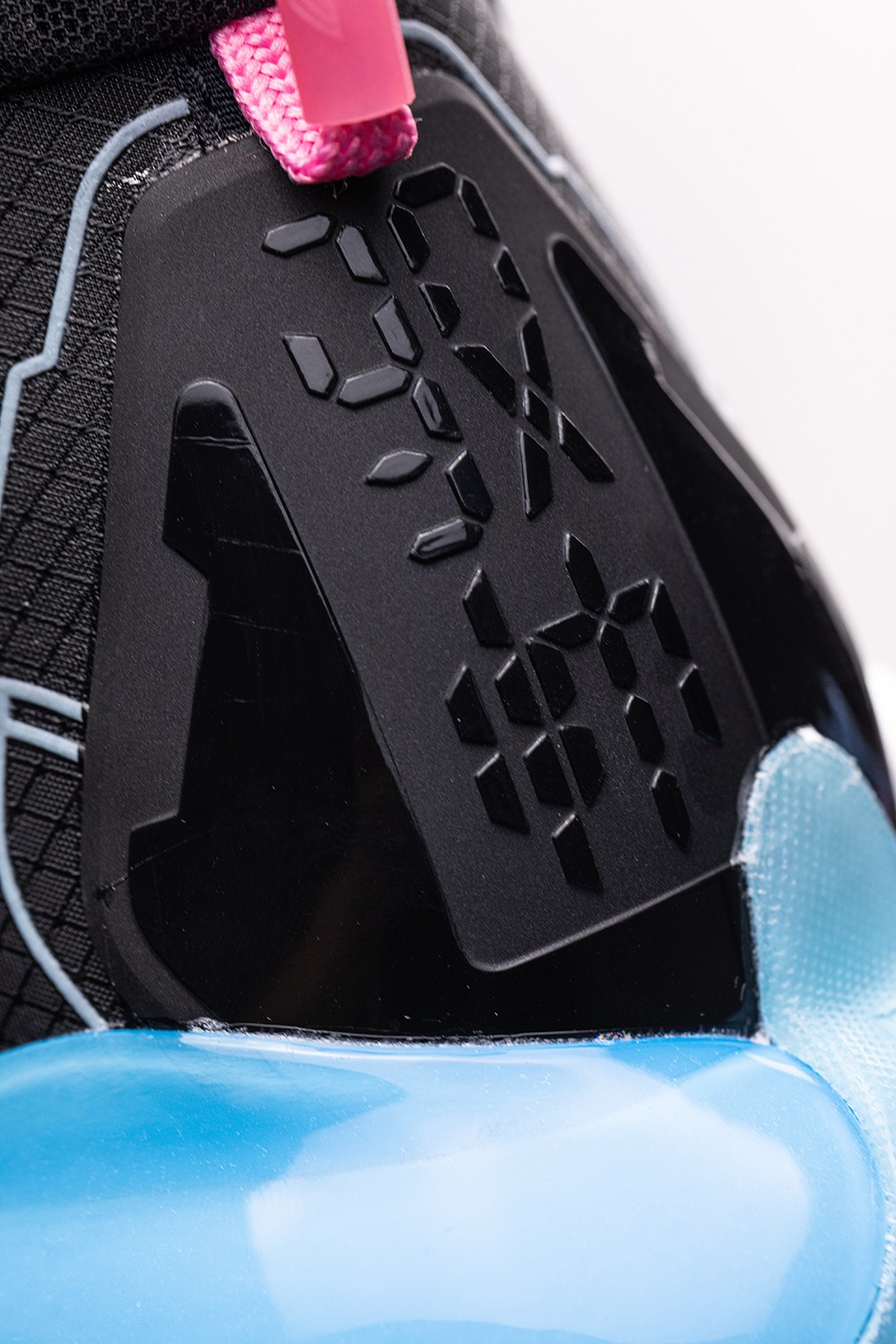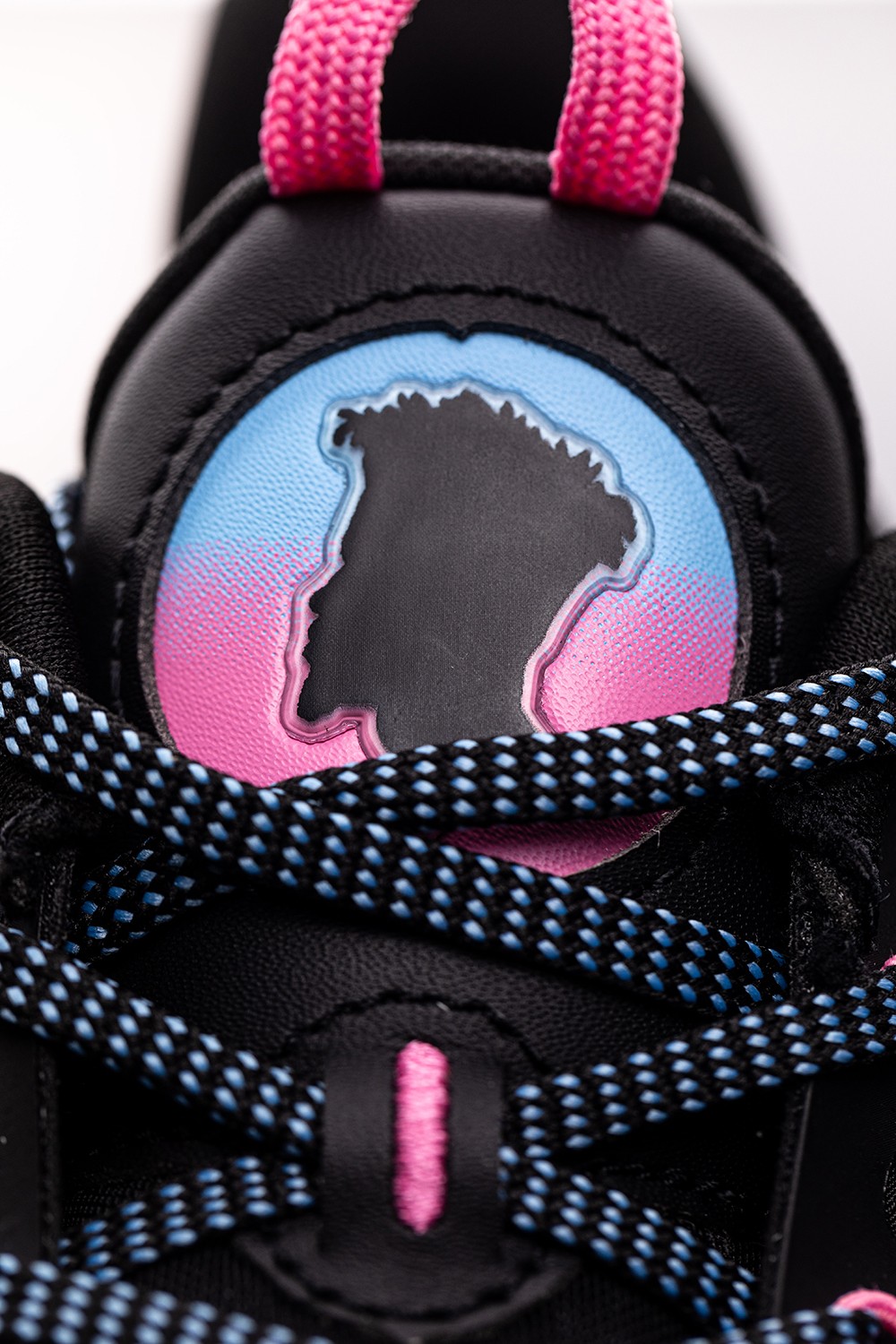 整双鞋采用一袭黑色装扮鞋身,鞋身点缀蓝粉双色呈现「迈阿密之夜」主题,相较于首发的白色更加耐脏、更酷炫。