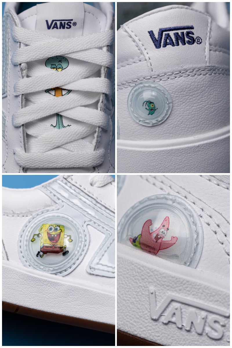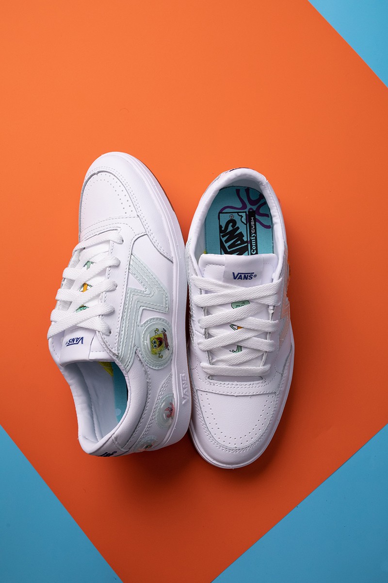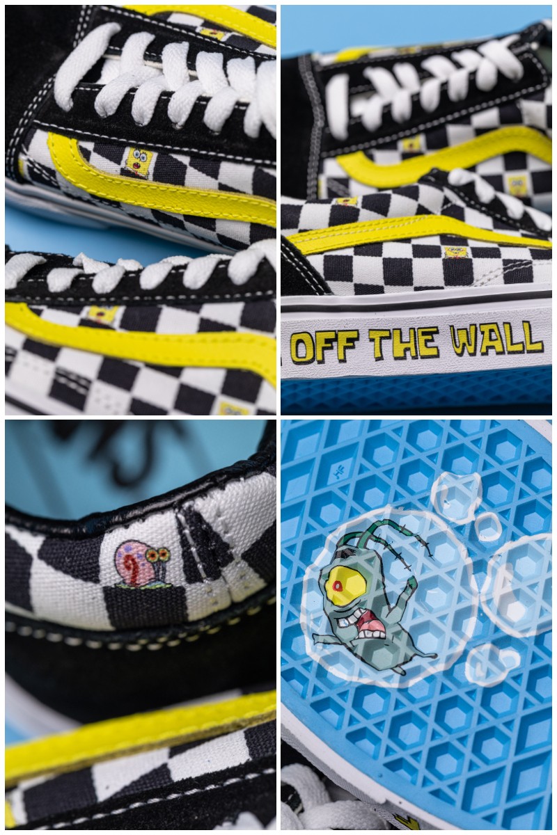 海绵宝宝与宠物小蜗藏于印花之中,痞老板这个倒霉蛋出现在外底位置,鞋侧 OFF THE WALL 标语则通过卡通字体呈现。