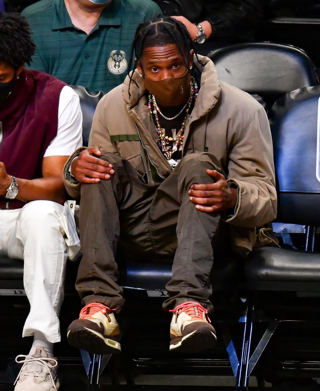 昨天, Travis Scott 前往篮网主场并且上脚了早先多次曝光的 Travis Scott x Air Max 1 “Cactus Jack”。