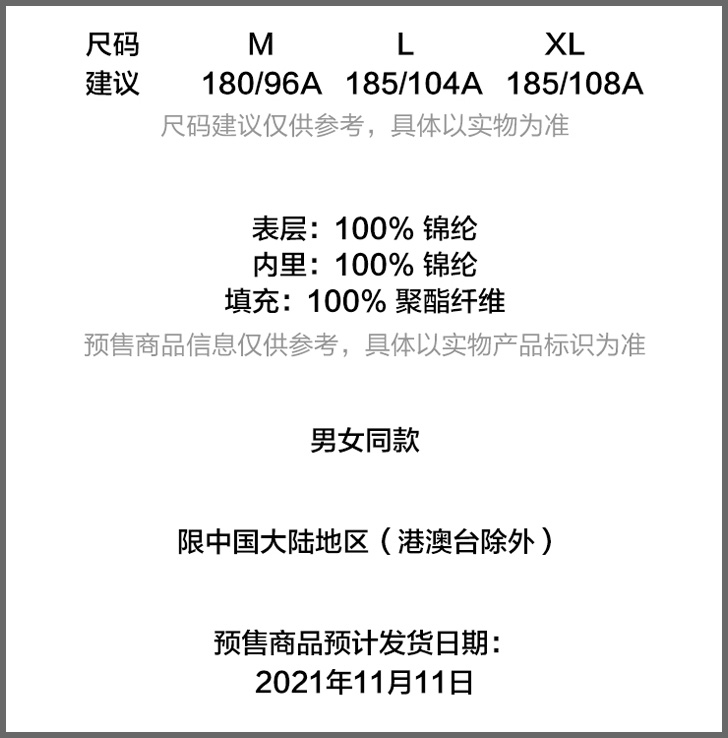 材质方面,官方显示采用锦纶与聚酯纤维共同打造,与此前猜测的羽绒服有所区别。