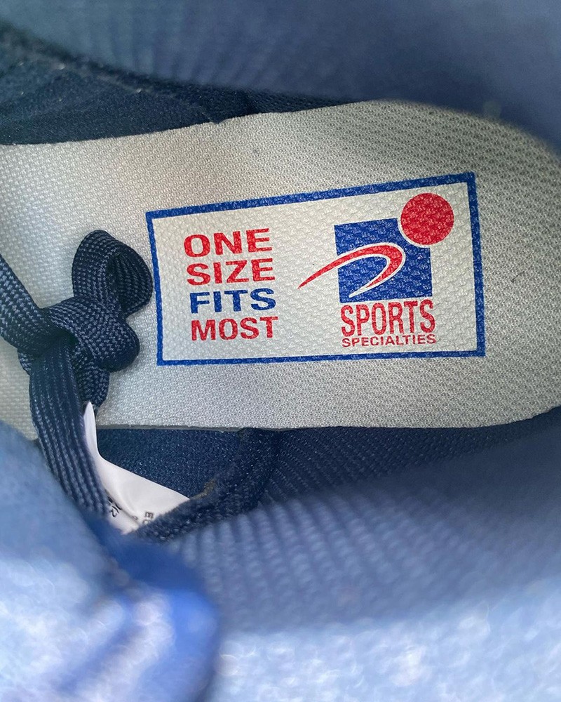 蓝色鞋面与绿色 Swoosh 辅以帽款常用的条纹质感示人,鞋舌与鞋垫点缀 Sports Specialties 帽款系列的专属 Logo,One Size Fits Most 则强调当时帽款后面的调节按扣,可以适用于不同头围,