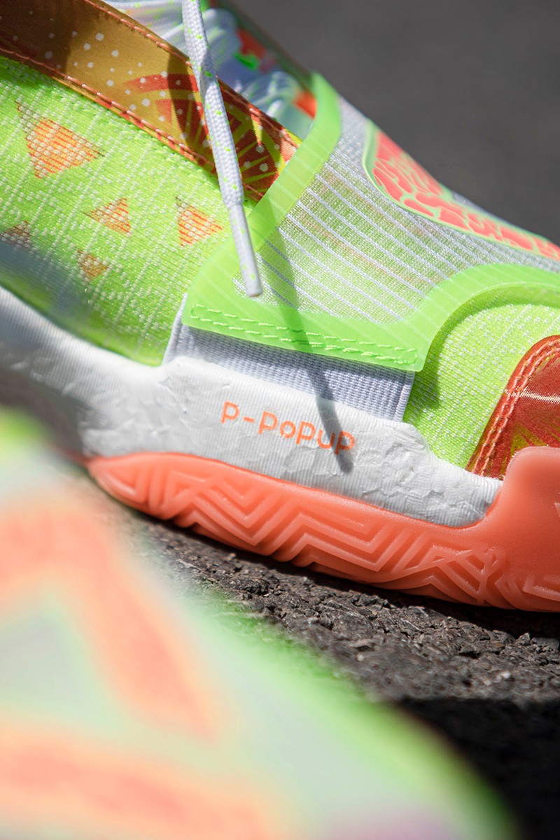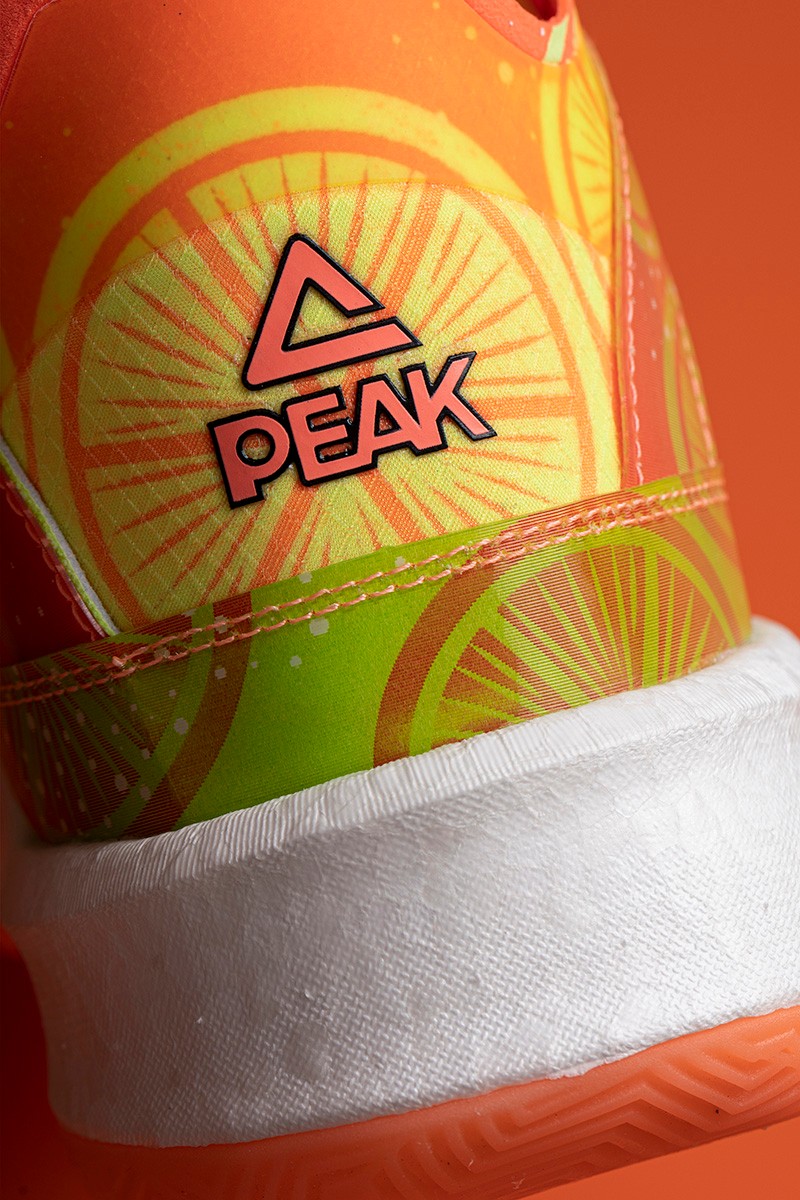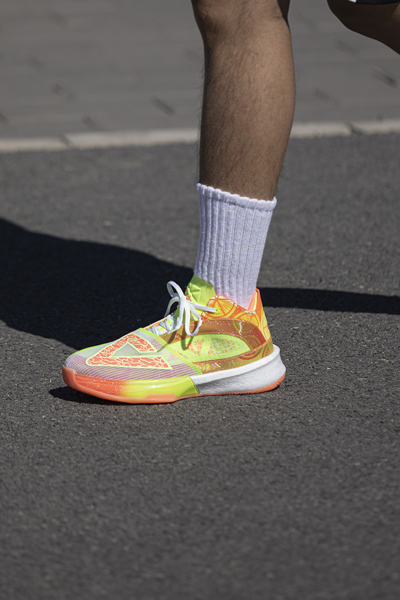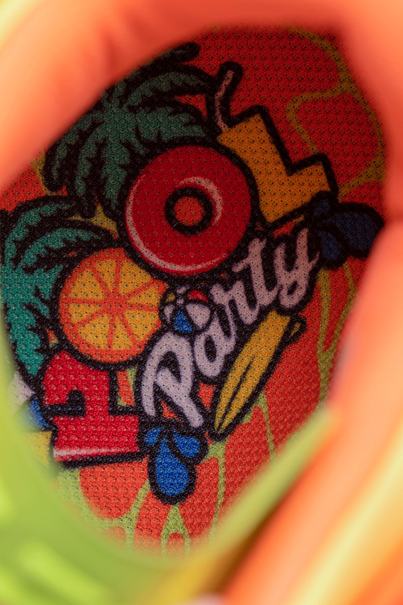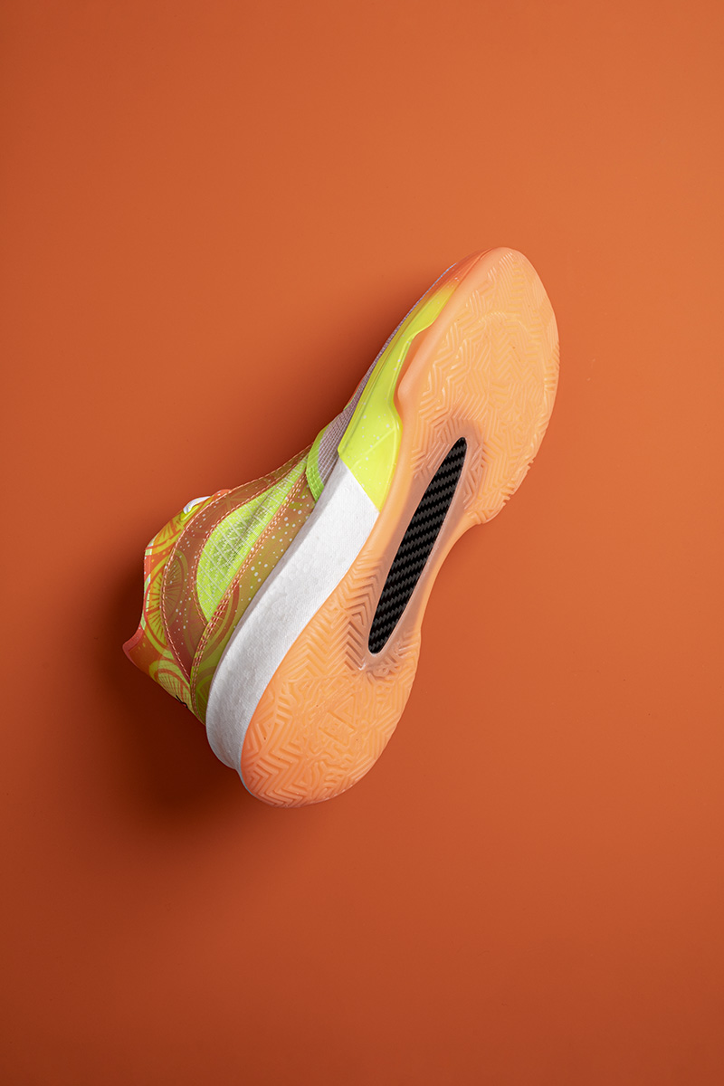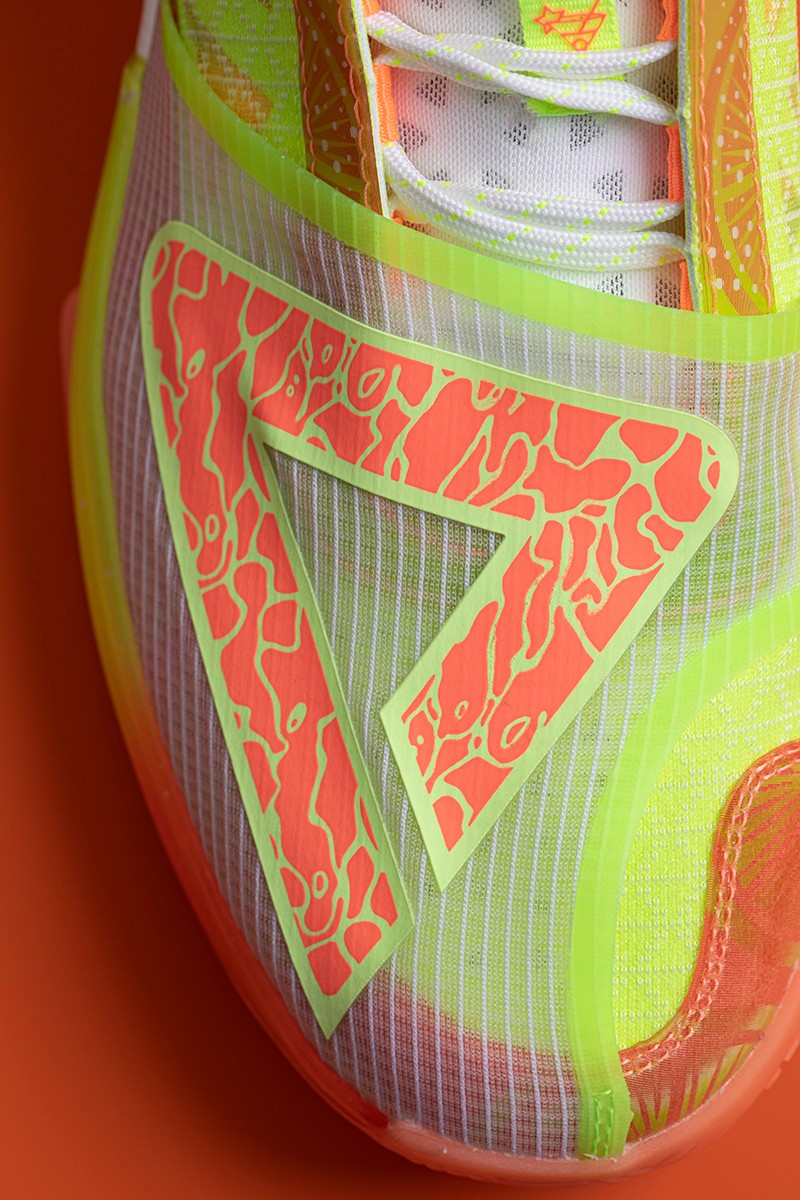 鞋身整体采用橙、绿渐变示人,细节加入柠檬片、气泡图案点缀,营造热带水果带来的酷爽感受。