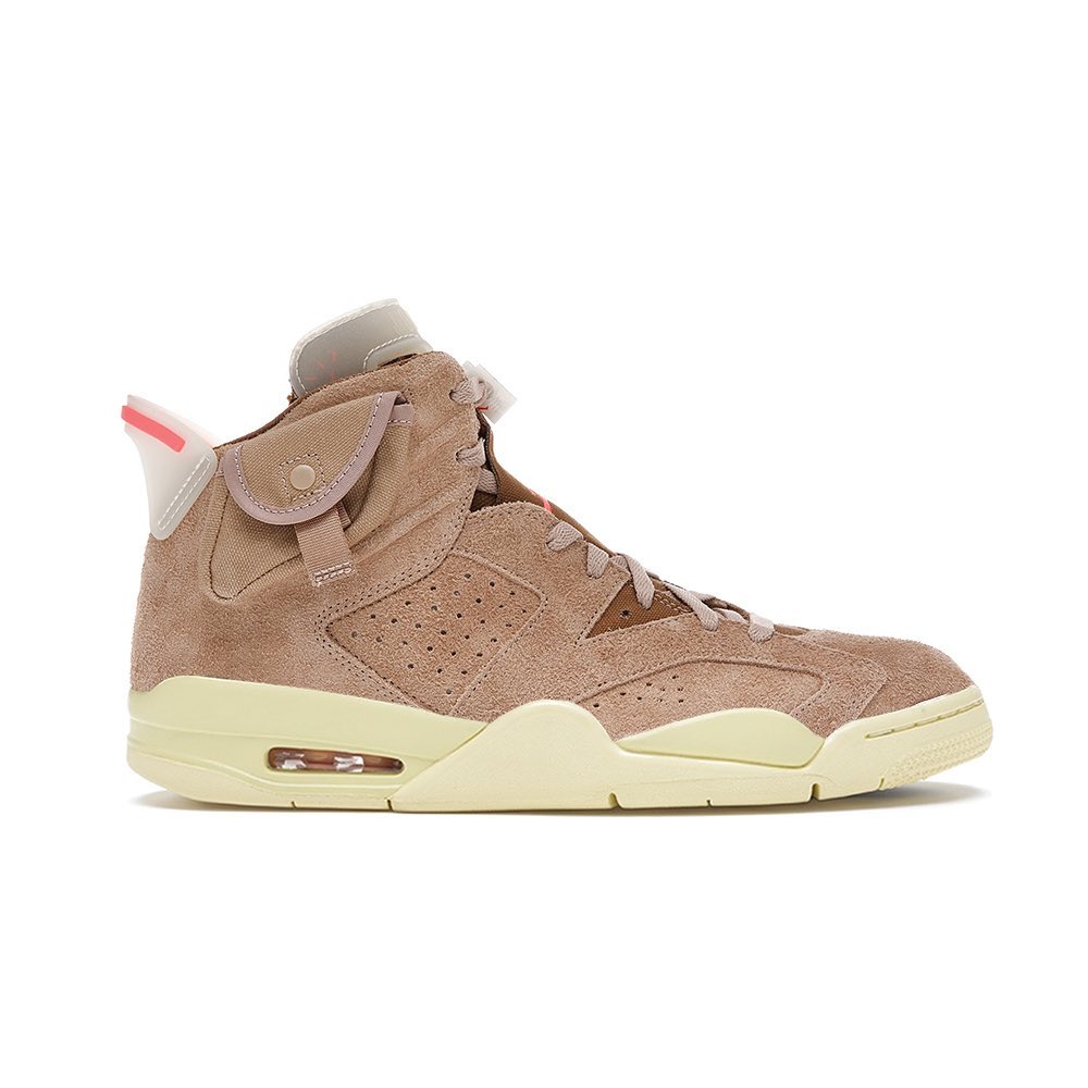 沙漠色主调装扮的 Travis Scott x Air Jordan 6 以一袭质感高级的麂皮材质打造鞋面,无奈发售的时节天气以及回暖,想要上脚确实有些难驾驭。