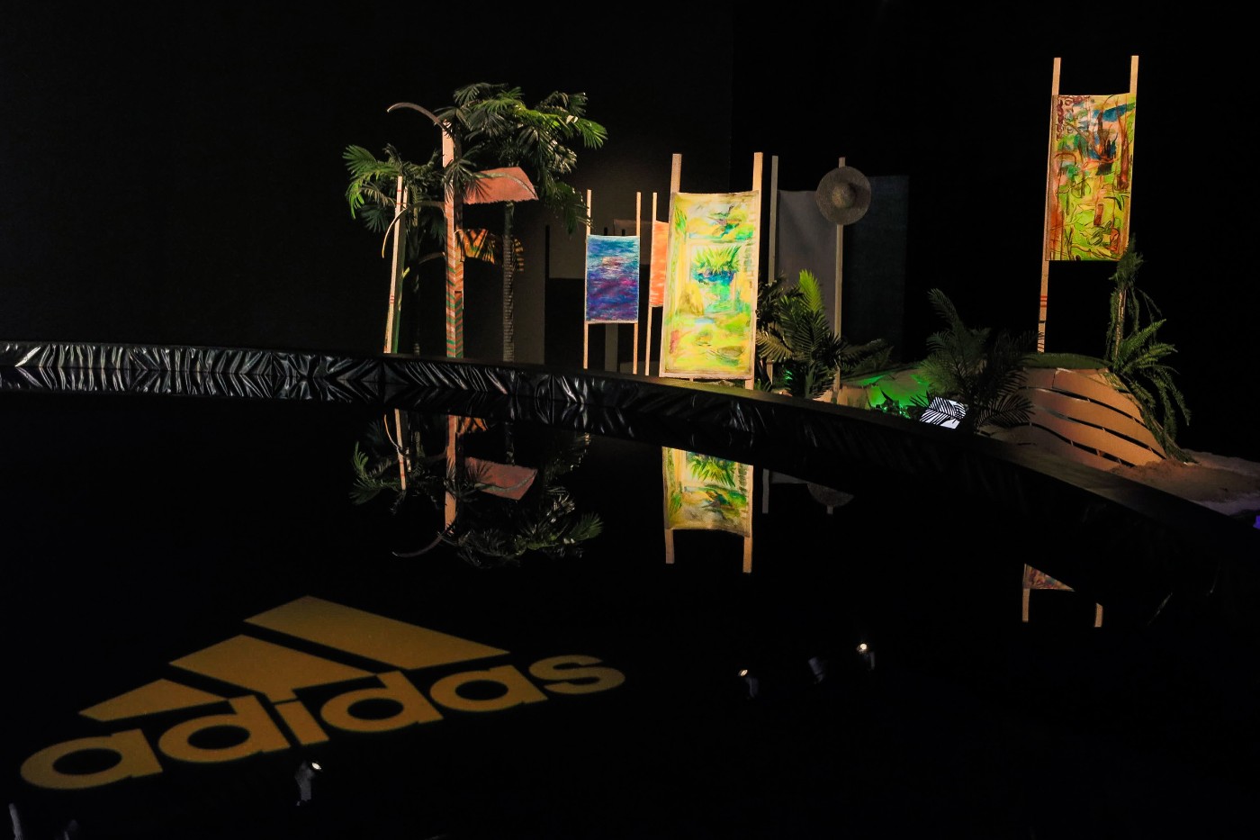 在跑道的终点,设计师以艺术装置的形式呈现 adidas 环保产品,诠释了 adidas 在产品技术上坚持创新,并探索环保材料在产品制造中的应用。