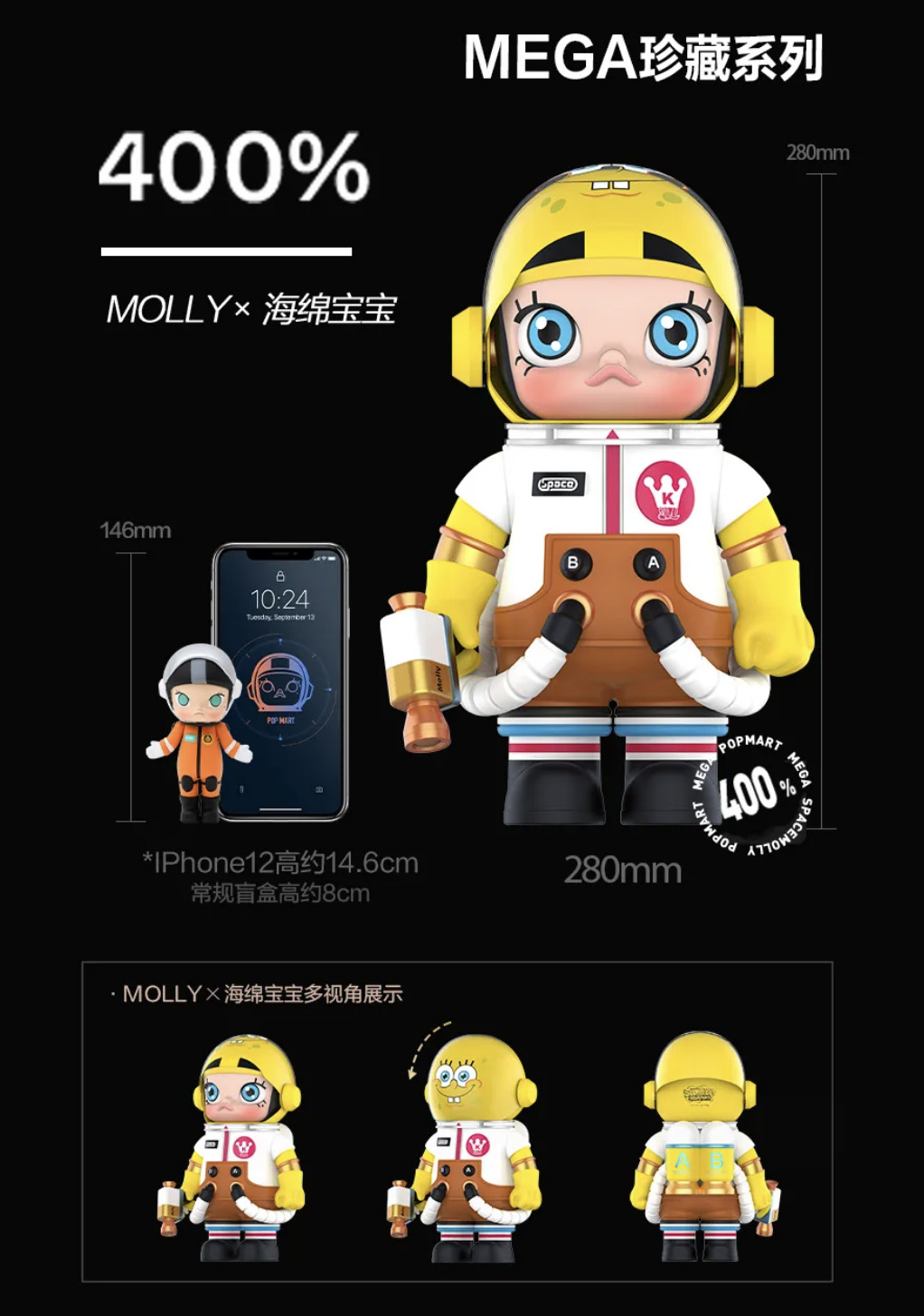 近期泡泡玛特带来全新 MEGA 珍藏系列 400% Space Molly x 海绵宝宝的正式发售,要知道此前同款主题的 1000% 几乎市价翻倍,高达 8000 RMB,人气超高!