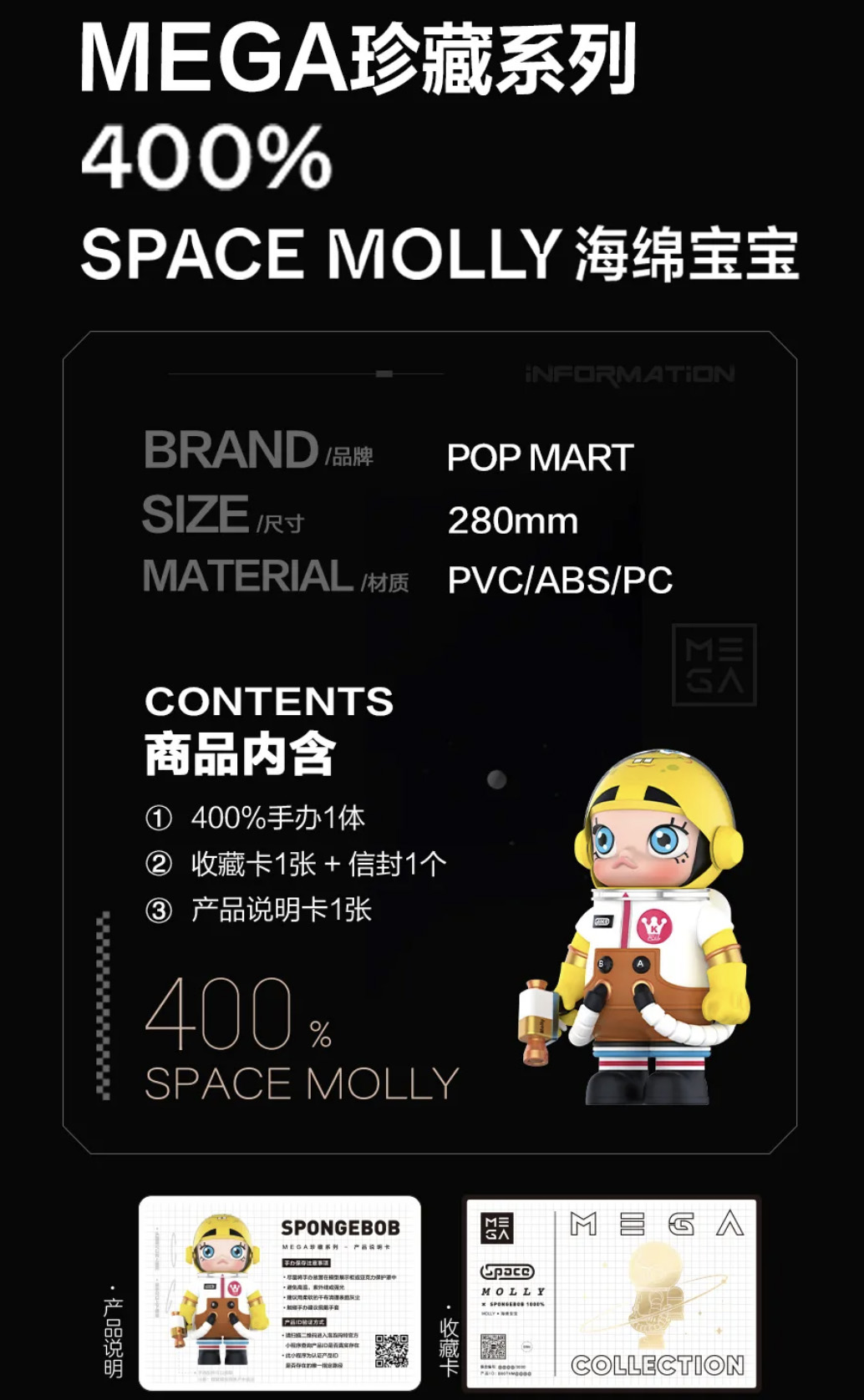 MEGA 珍藏系列 400% Space Molly x 海绵宝宝确定将在 6 月 25 日早 10 点,在泡泡玛特天猫旗舰店、泡泡玛特部分门店、泡泡玛特抽盒机、得物APP、SOLESTAGE 同步发售,定价 ¥1299 RMB。