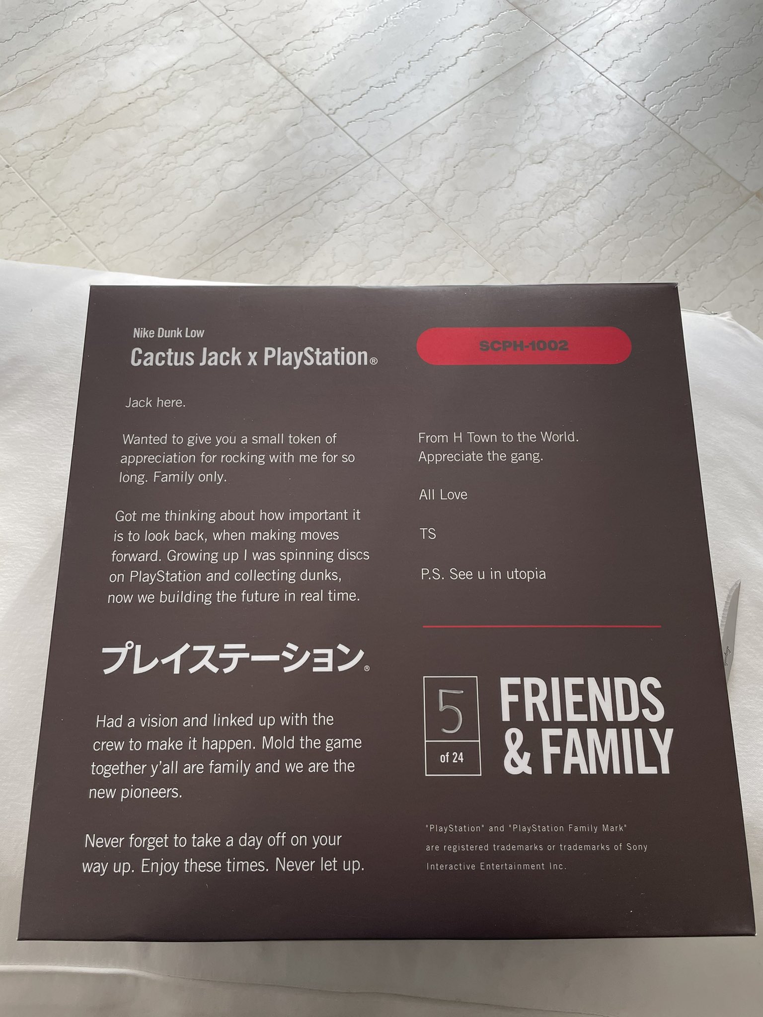 比 PlayStation 5 还大的特殊鞋盒,显示出这双鞋的官方名称:Cactus Jack x PlayStation x Nike Dunk Low。