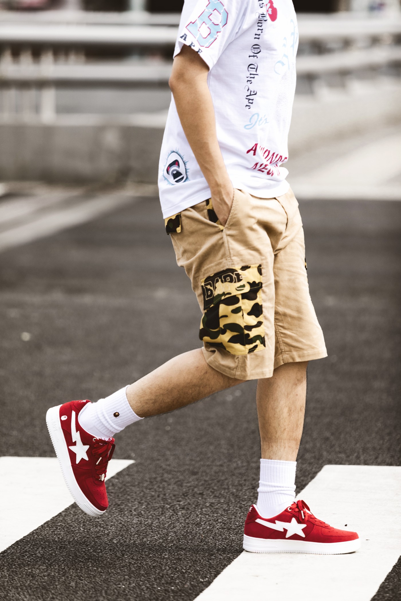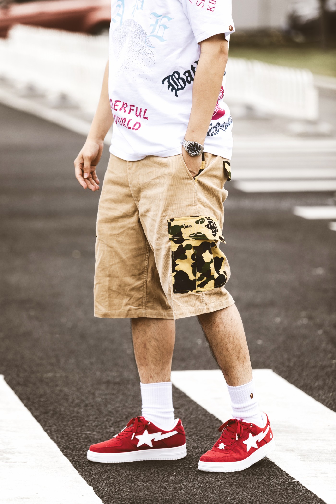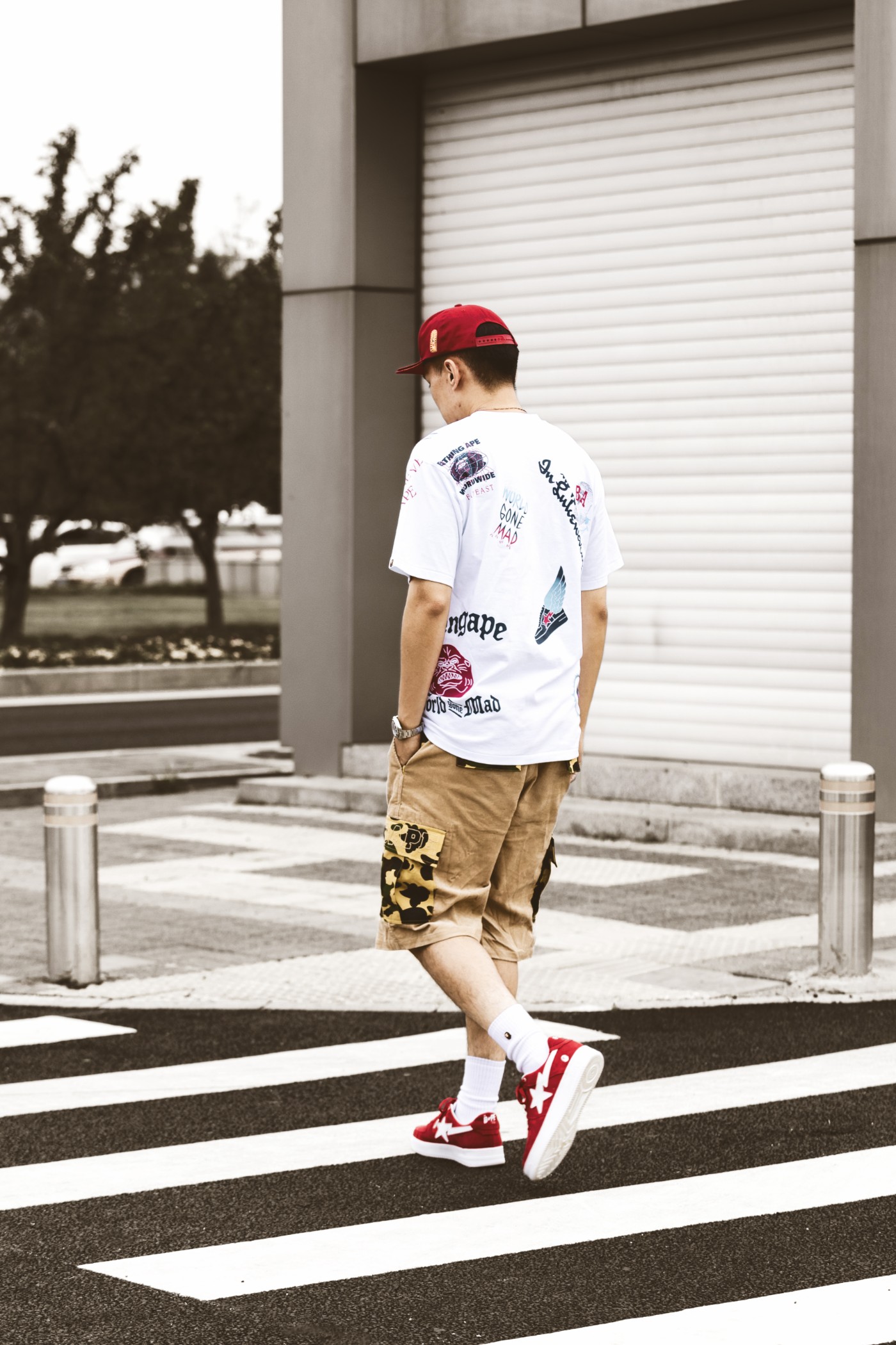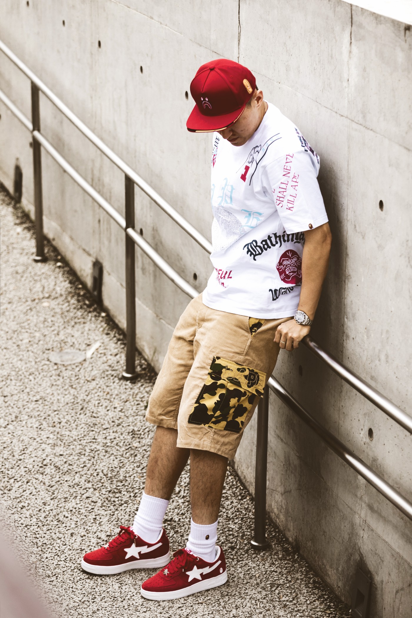 红麂皮配色小编选择搭配白色印花 T 恤和卡其 + 迷彩短裤,再加上红色棒球帽与鞋子呼应,看起来 Old School 气质十足。