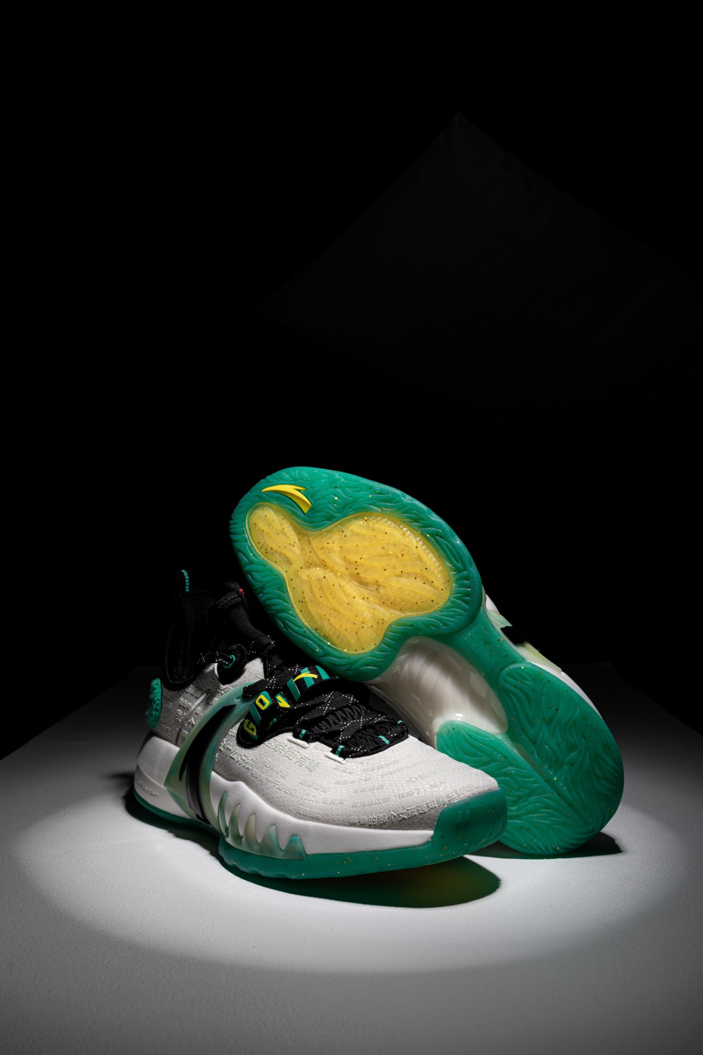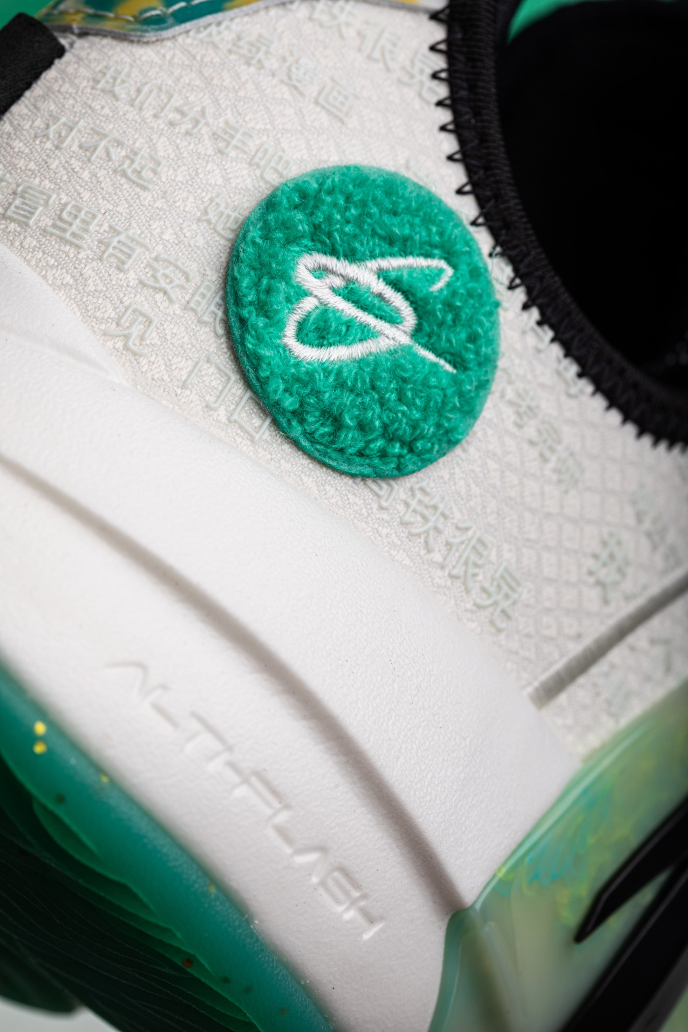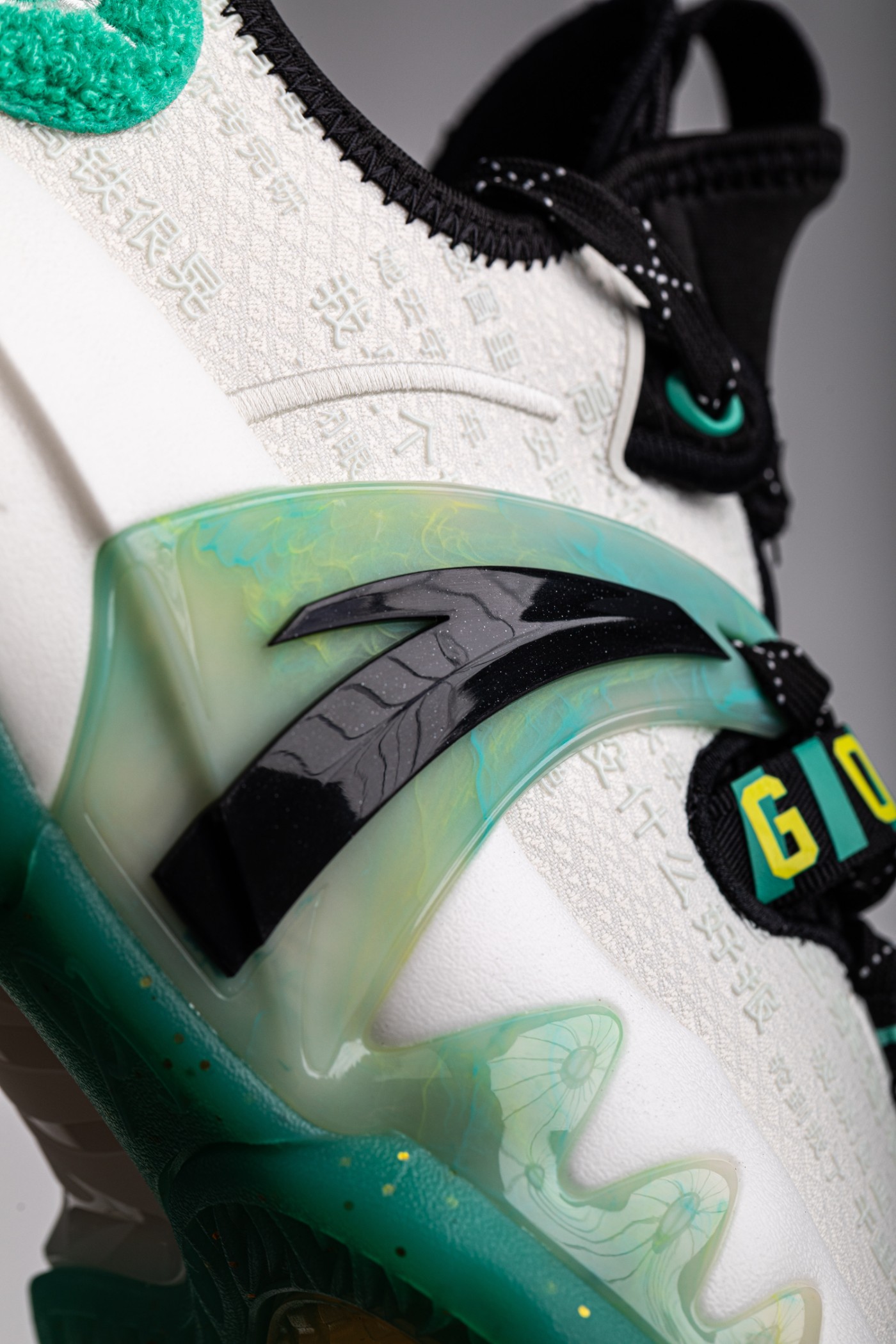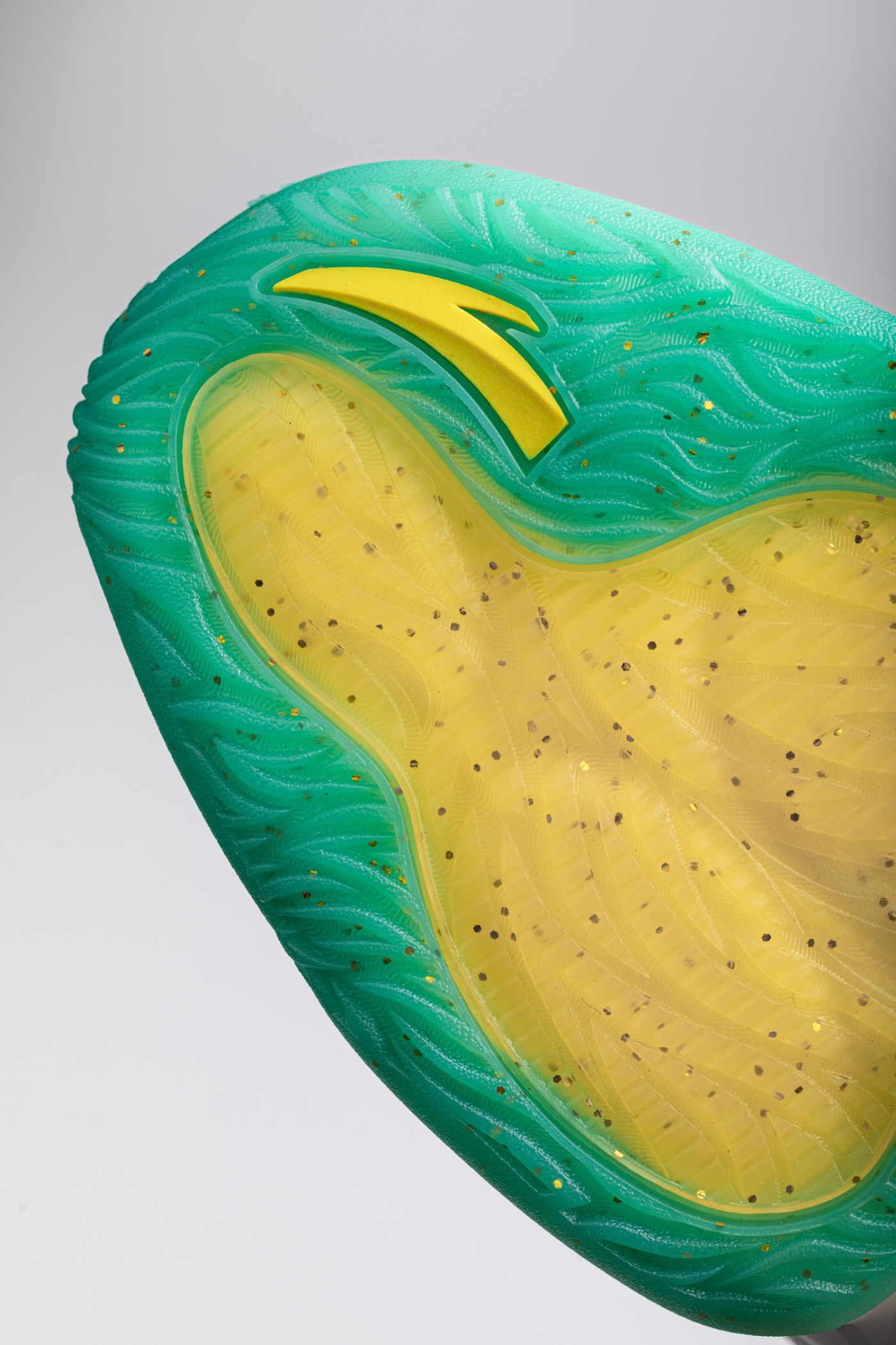 侧面绿色「大虎牙」TPU 支撑,采用半透明质地,并以绿色和金色晕染点缀,质感非常独特。