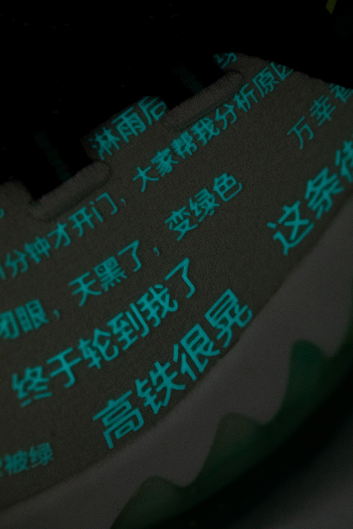 鞋身的白色文字和 TPU 部分还有夜光效果,生动展示了什么叫 “天黑了,变绿色”,太扎心了。