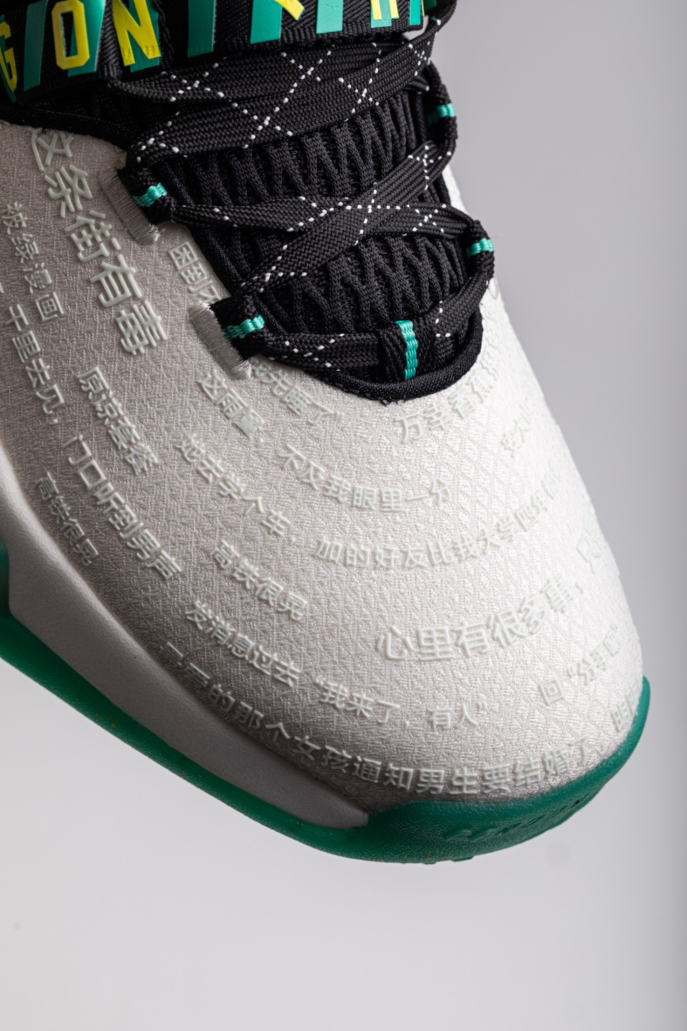 乍看平平无奇,但仔细一看就会发现,鞋面布满了立体的文字。
