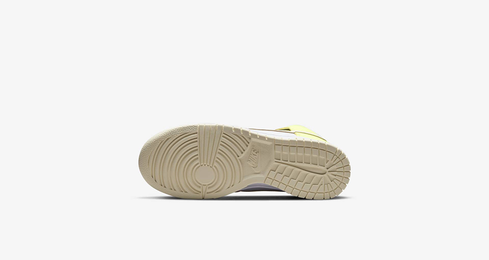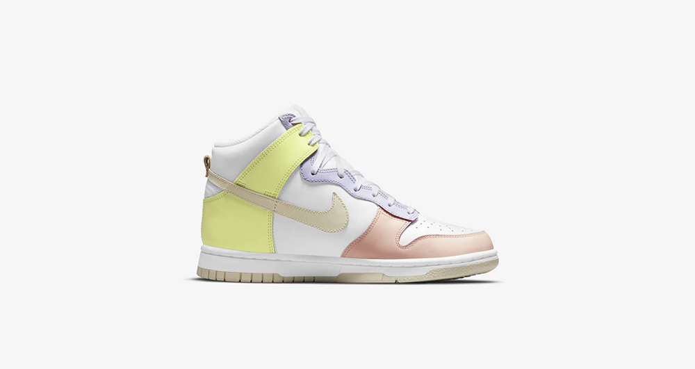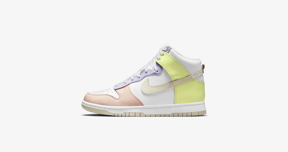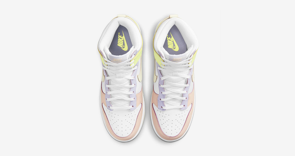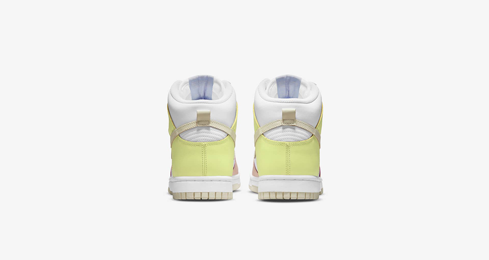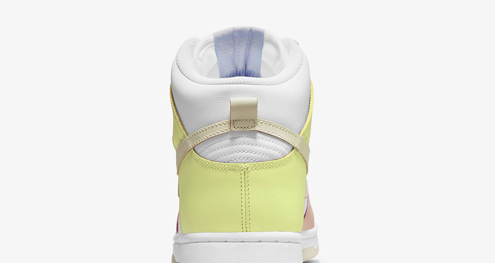 整双鞋在 Dunk Hi 的基础上,采用白色作为主调,鞋身框架采用马卡龙风格的粉色、紫色以及黄色装扮。