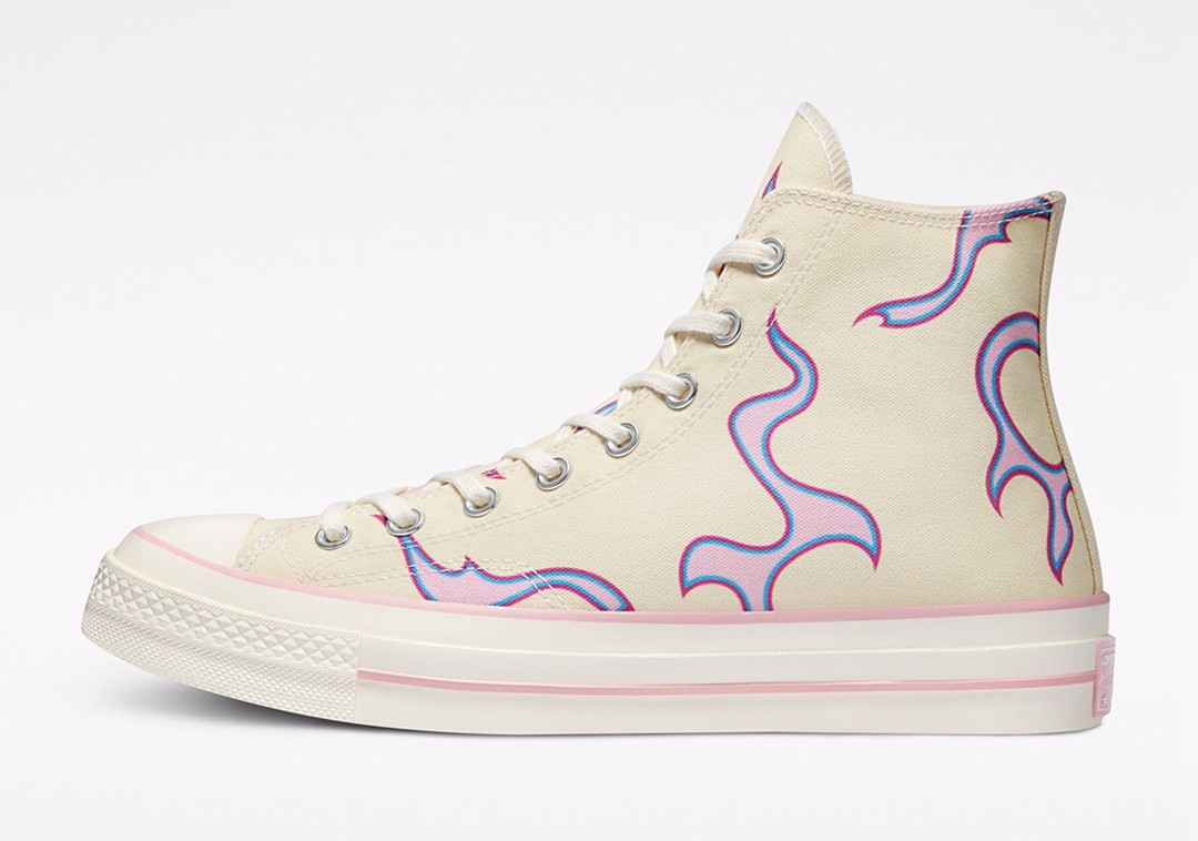 此次全新联名采用 Converse Chuck 70 为设计蓝本,米白色的帆布材质覆盖整个鞋面。
