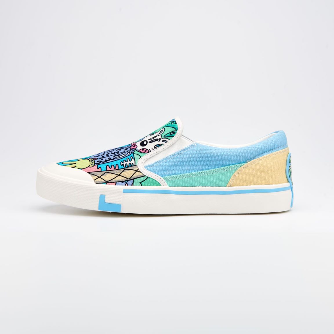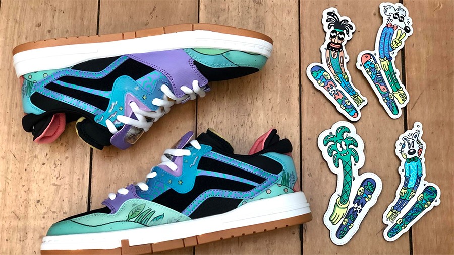 不仅涂鸦绘画被广泛收藏、价值不菲,更与宜家、微软、可口可乐等大牌开展跨界联名,2019 年还曾担任广州 Sneaker Con 艺术总监,操刀鞋圈盛会的独家海报!