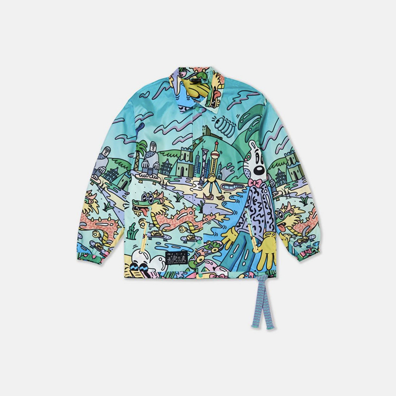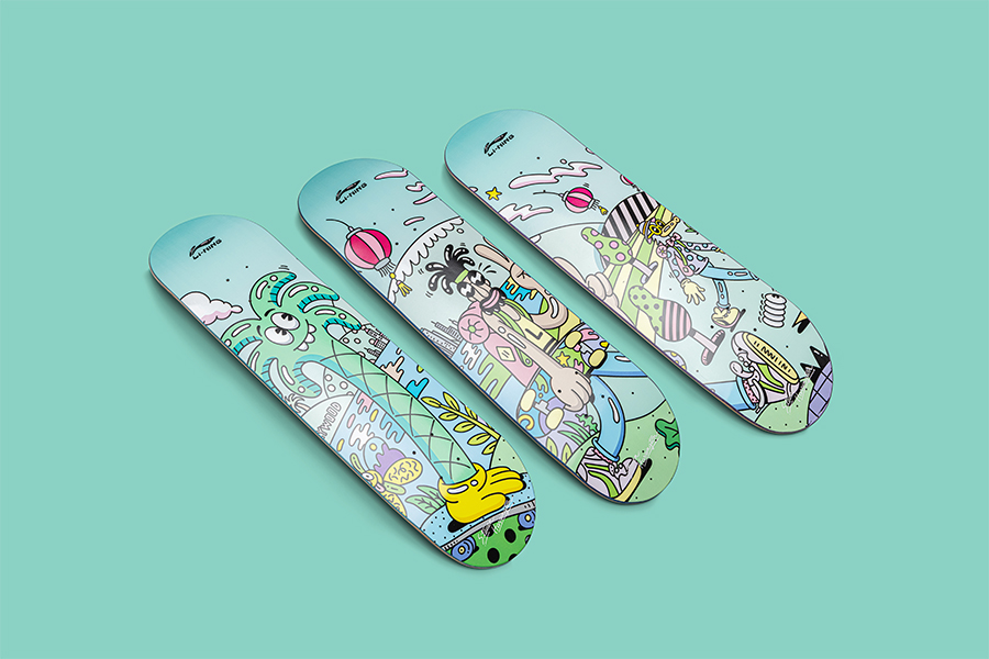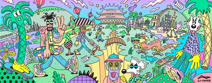 完美彰显浓郁个人风格的同时,最大亮点在于他笔下经典的卡通人物,均与龙、长城、故宫等中国标志性元素及建筑相融合,熟悉的 Li-Ning 标志也得以通过街头风格被重现演绎。
