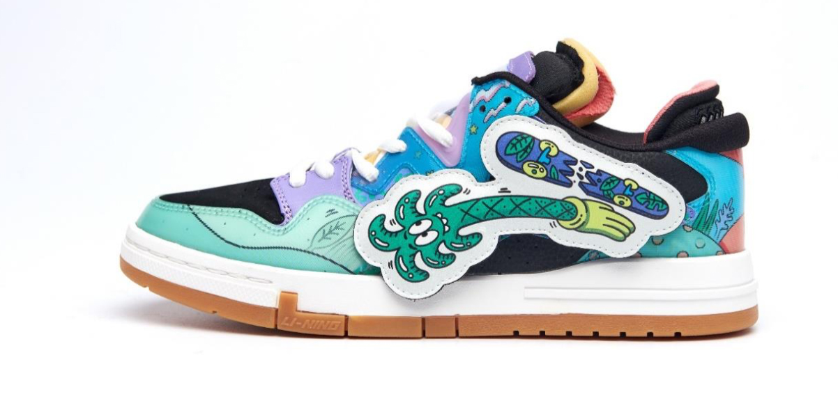 鞋侧李宁 Logo 特别辅以 4 个卡通人物形象的魔术贴呈现,惟吾PRO 标志性的双层鞋舌也暗藏趣味滑板元素。