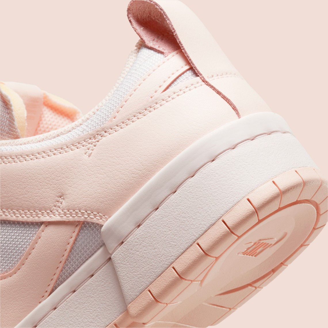 Dunk Low Disrupt 与传统 Dunk 相比具有强烈的解构风格,粉色为主调的鞋身,视觉上给人一种粉嫩的少女风。