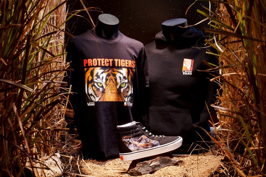 此次 Vans x Discovery Inc 全新的联名系列以老虎为主题打造了包括 ComfyCush Sk8-Hi、Slip-On 两种鞋款,及服饰背包。