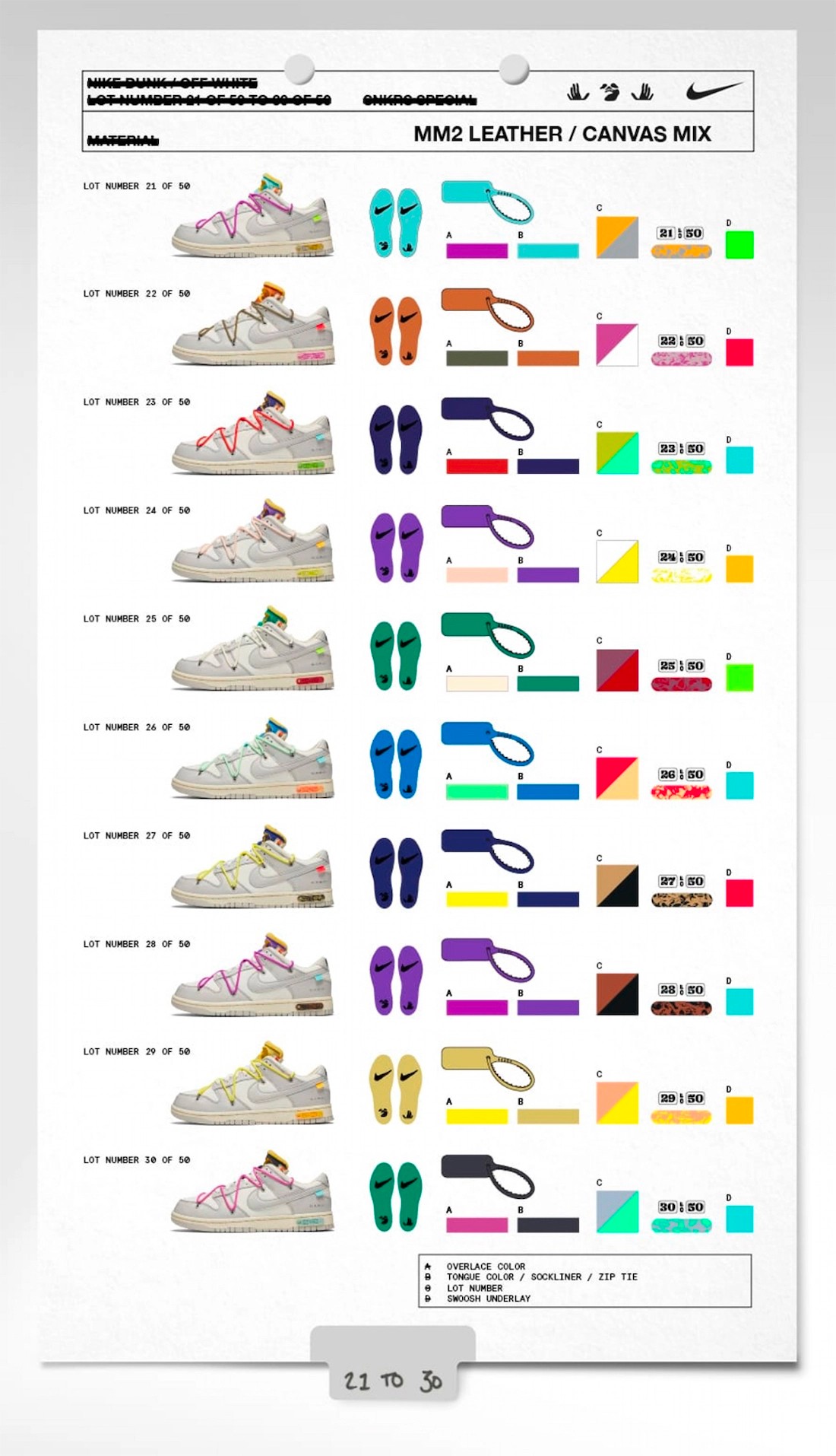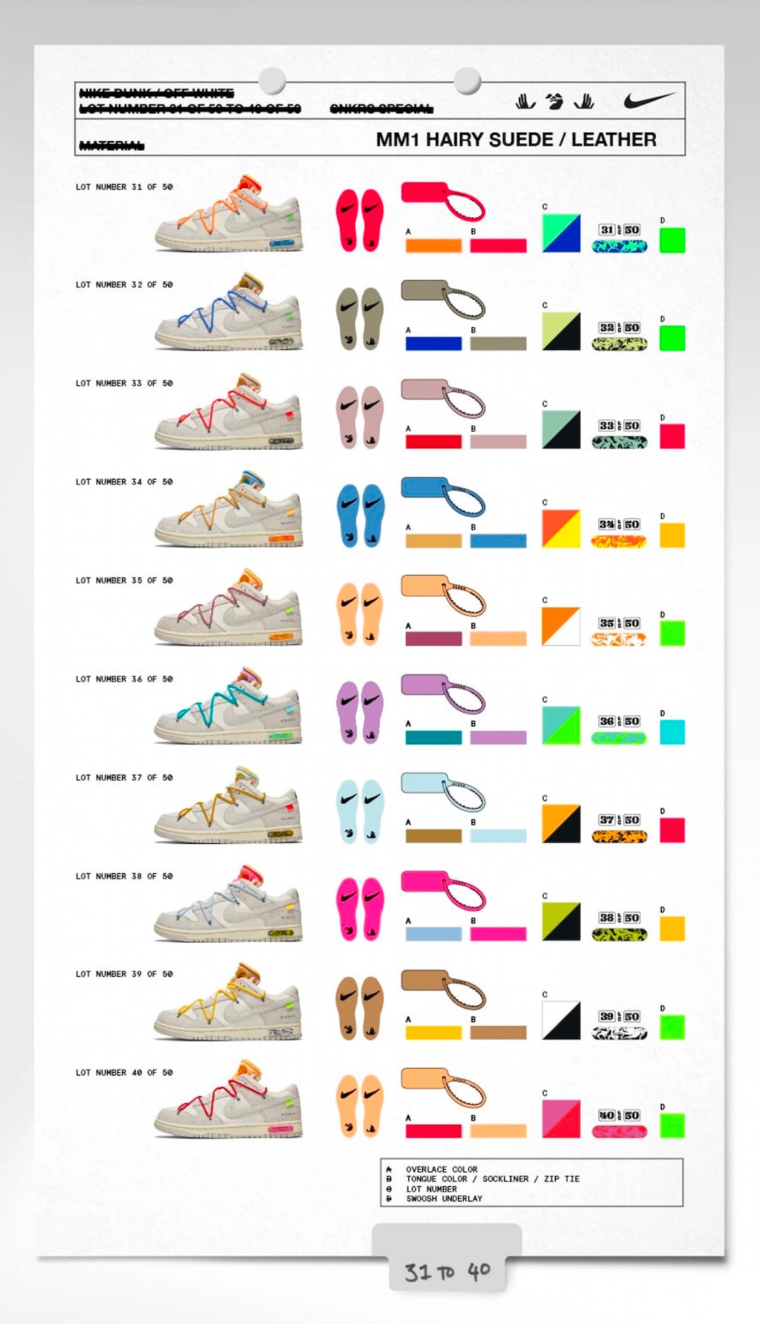 从官方设计稿中可以看出,每 10 款分为一组,每组拥有其专属的鞋身材质,但鞋带、鞋舌、防调包扣、后跟序号则各不相同,带来 Virgil 调色盘的究极诠释。