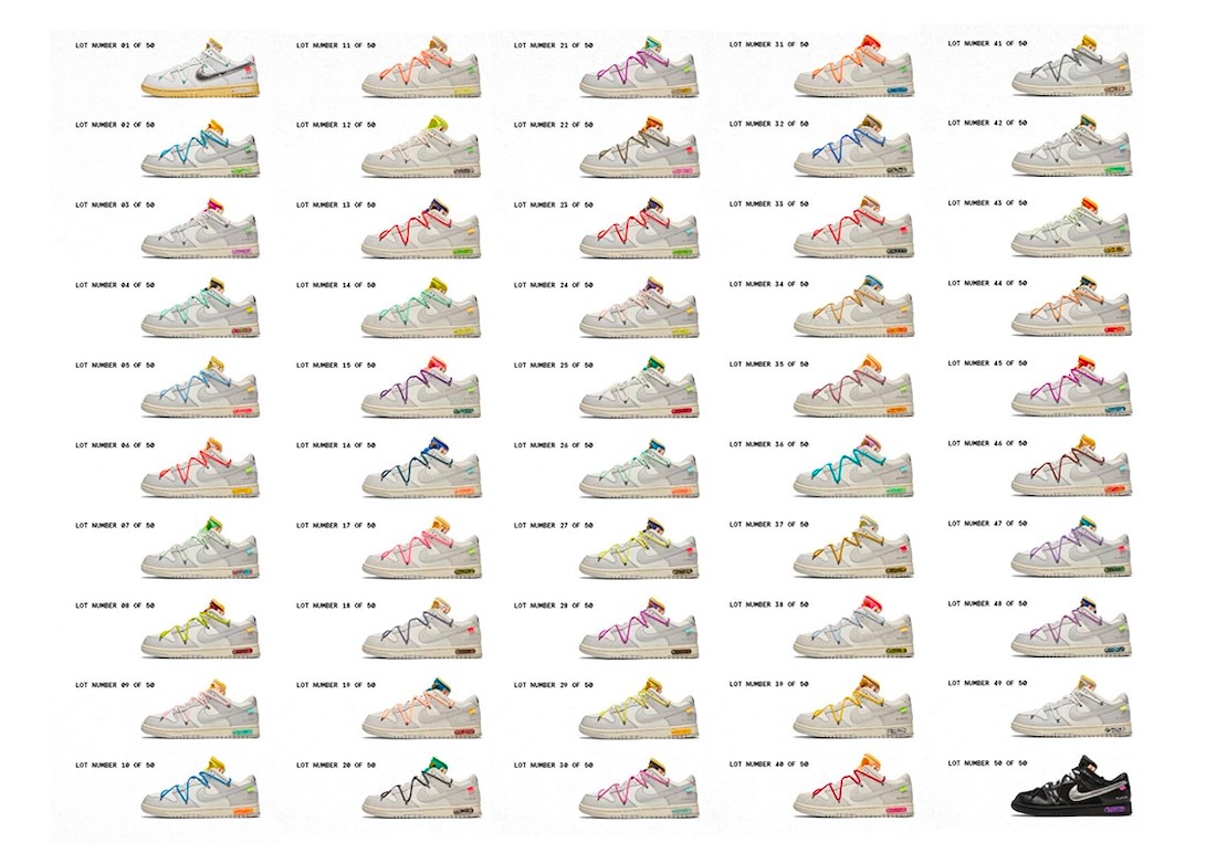 均以 Dunk Low 为蓝本,除 01 号和 50 号分别是纯白、纯黑外,其他 48 款都是灰白配色为主体。