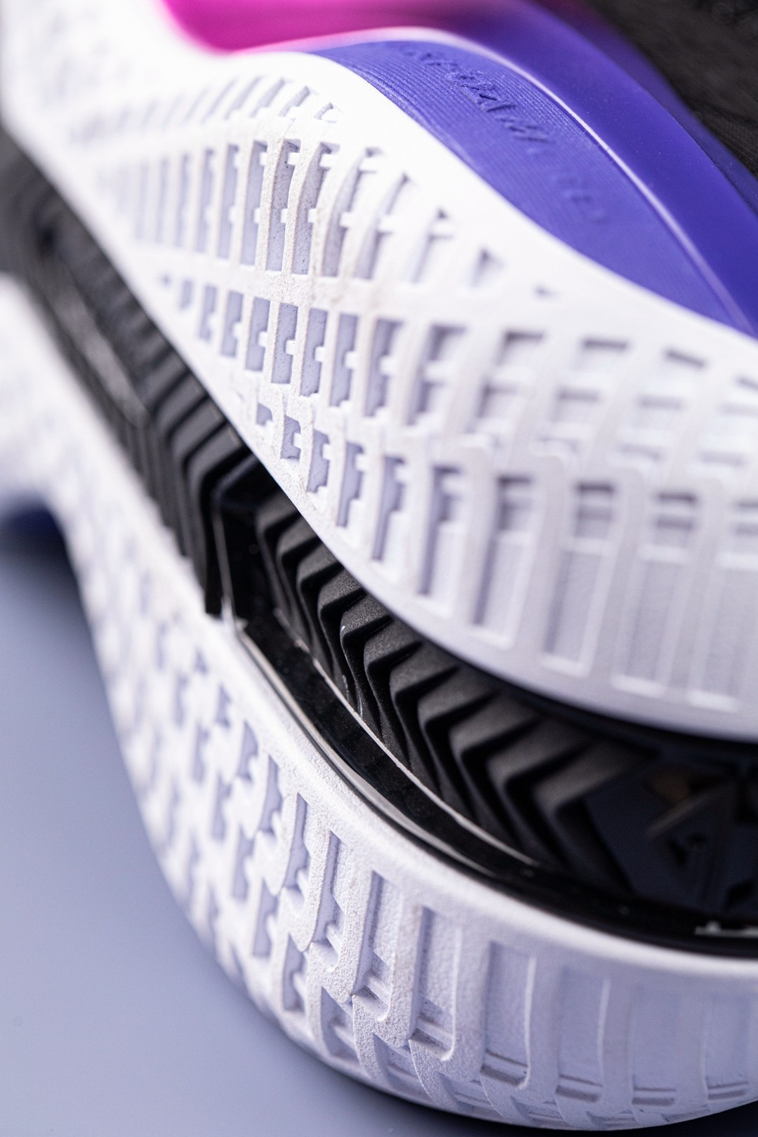 后掌纹路选择了 361° 的 “3” 作为纹路,除此之外中底还加入了浮动设计,更进一步保证抓地力。