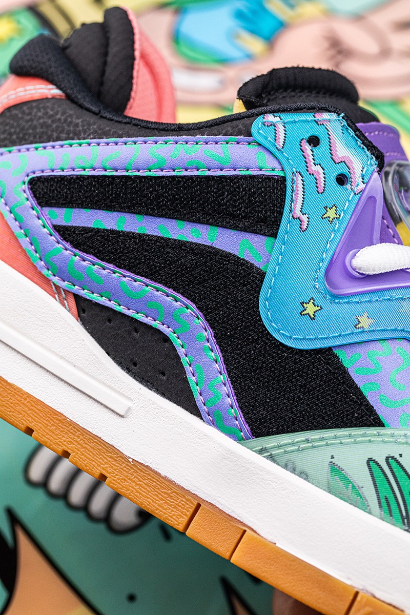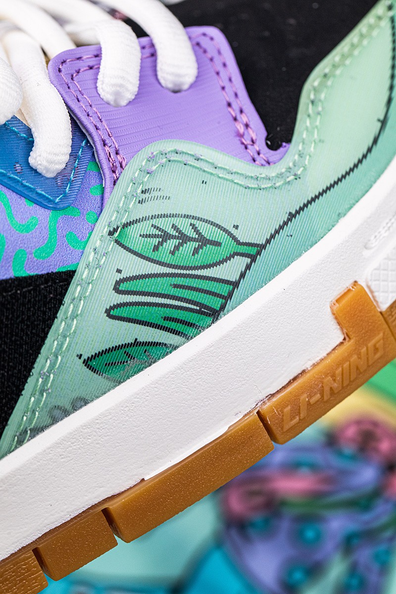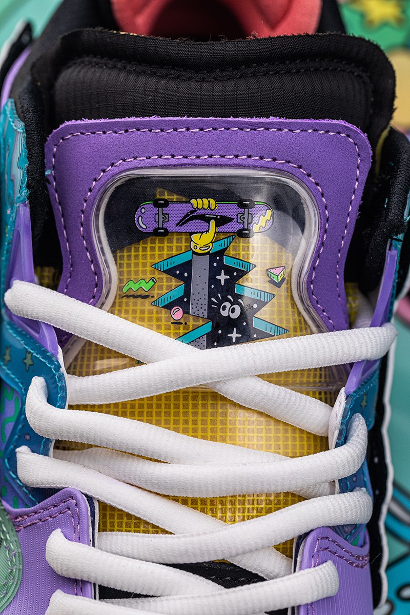 鞋侧李宁 Logo 则将四个卡通人物形象通过魔术贴的手法立体呈现,增加趣味性的同时,也带来多样的造型变化。