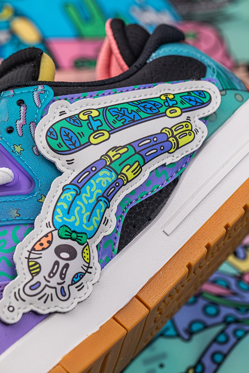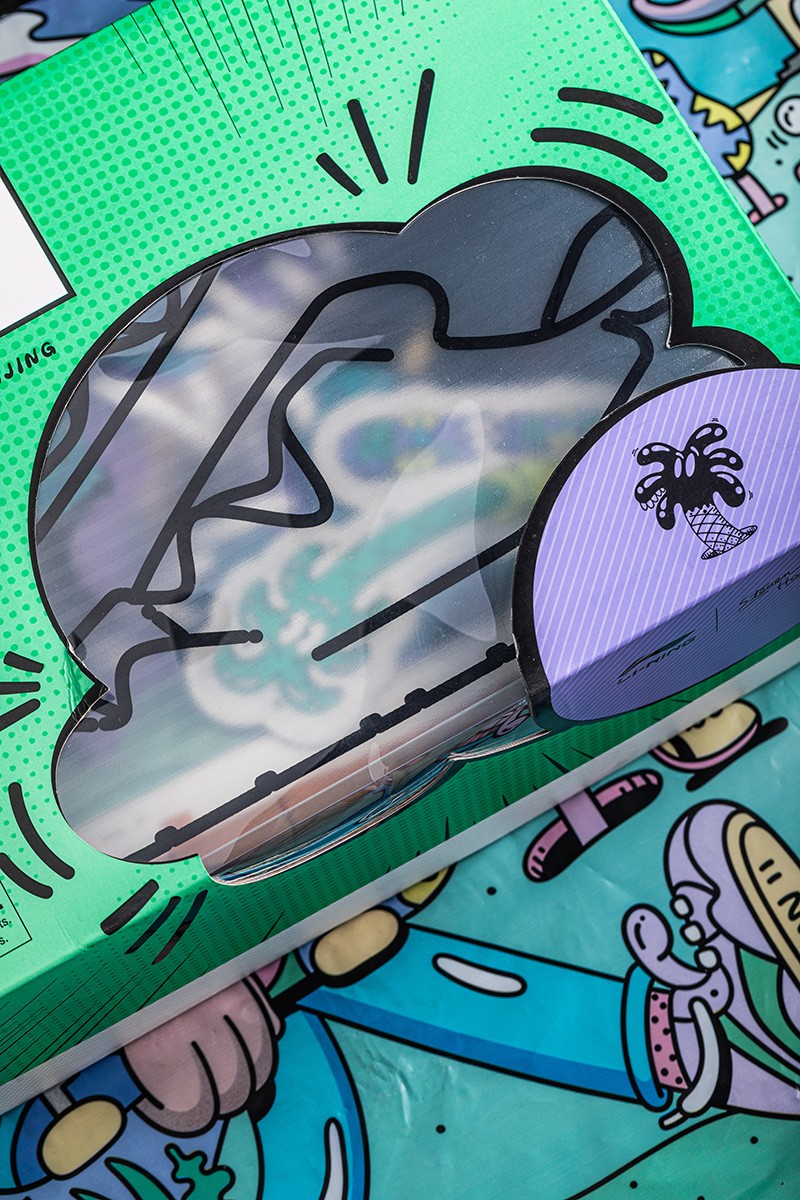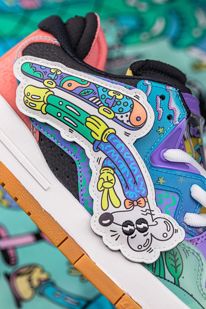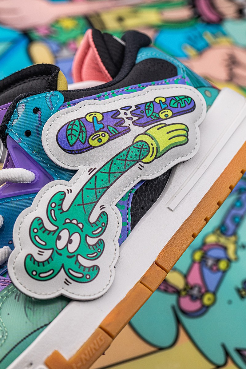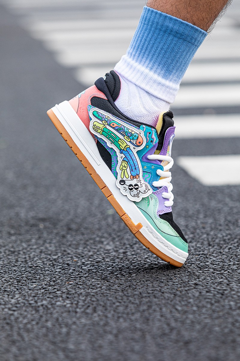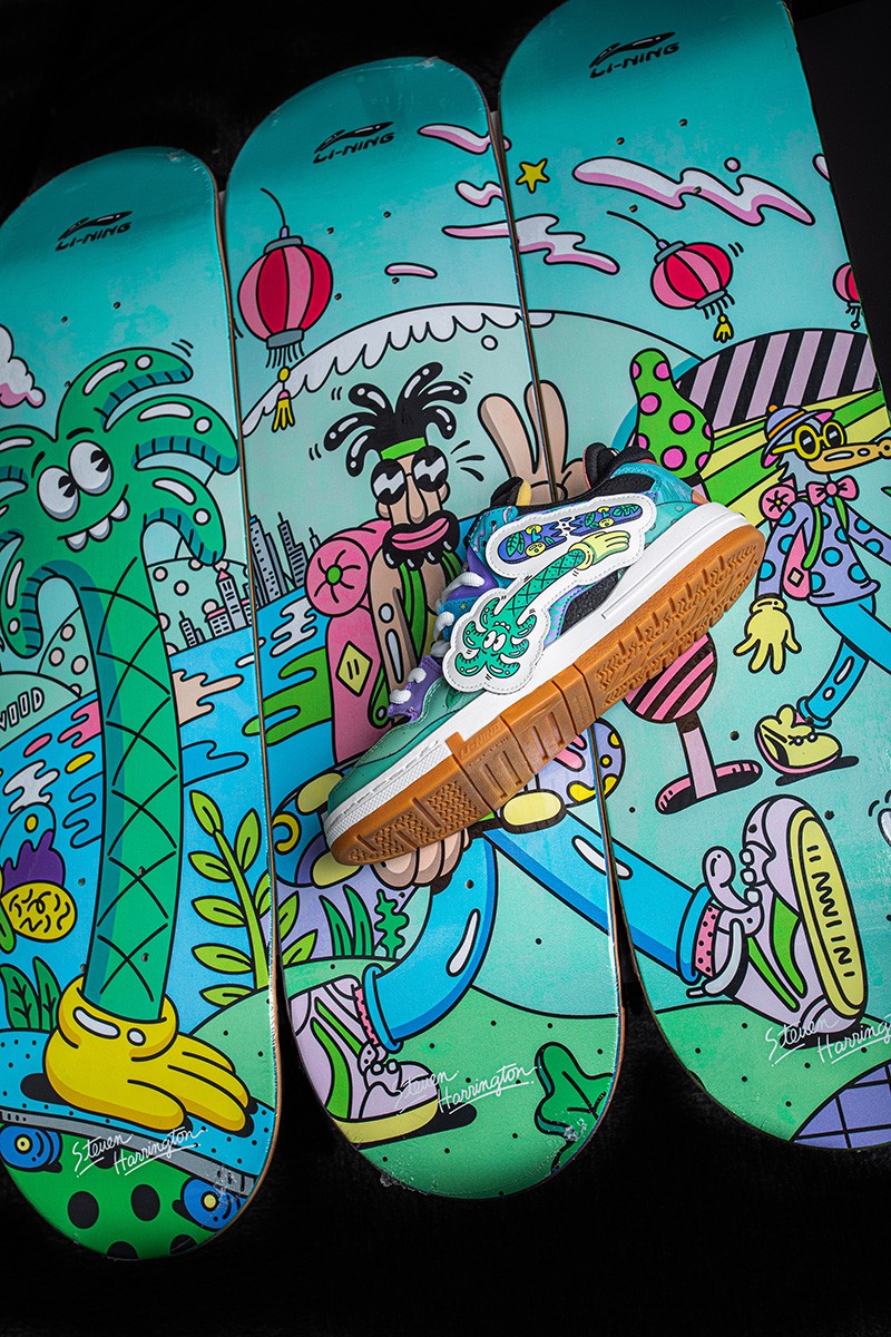 本次联名鞋款以专业滑板鞋「惟吾PRO」为载体, 结合 Steven Harrington 拿手的手绘图案,以粉笔画色调充分展现轻松惬意的主题风格。