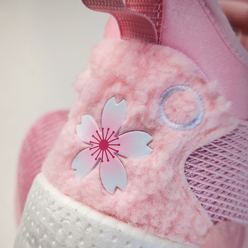 后跟处搭配植绒面料,并点缀樱花刺绣,彰显配色特殊身份的同时造型格外吸睛。
