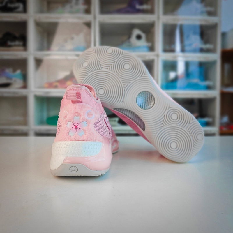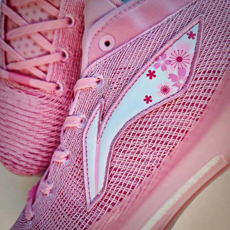 侧身的李宁 Logo 以白色呈现,同时缀以樱花造型,呼应配色身份。