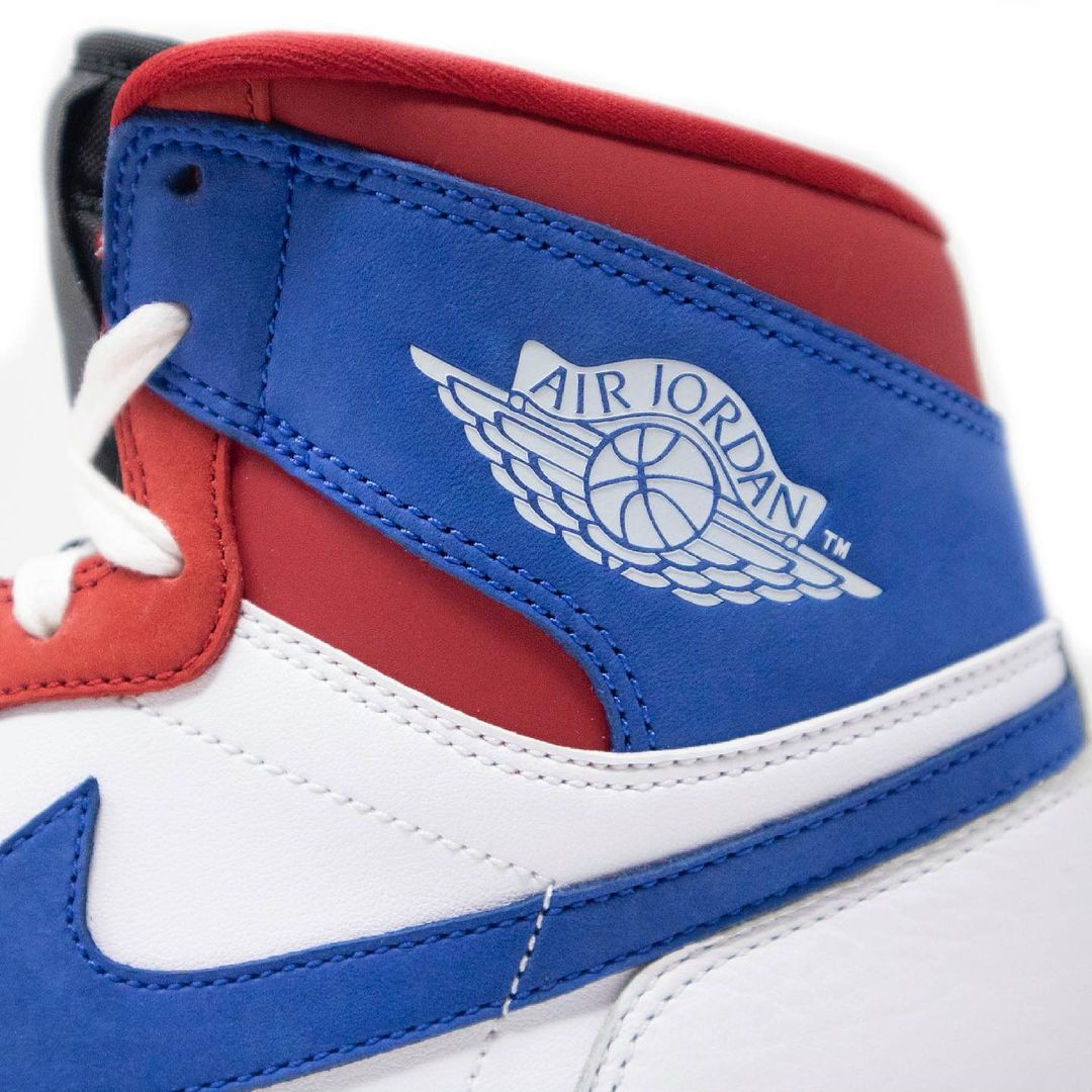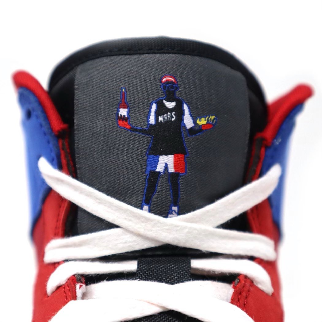 右脚鞋舌点缀斯派克·李的全身照图案,依旧融入法国国旗元素呼应主题。