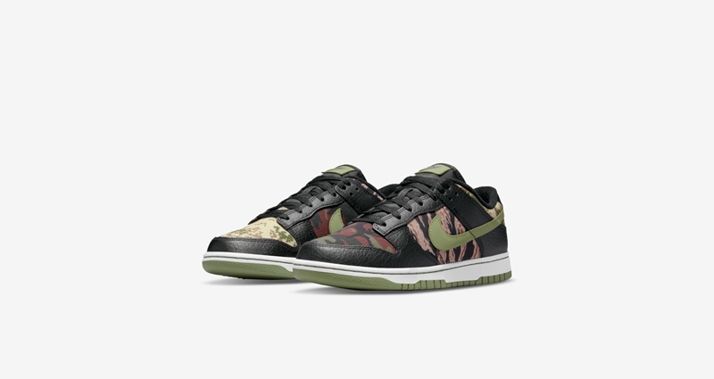第二款「鸳鸯迷彩」Nike Dunk Low 采用了多重迷彩构建,鞋身磨砂质感的柔软皮革构建轮廓,丛林、沙漠、虎纹三种迷彩辅以不对称的撞色设计示人。