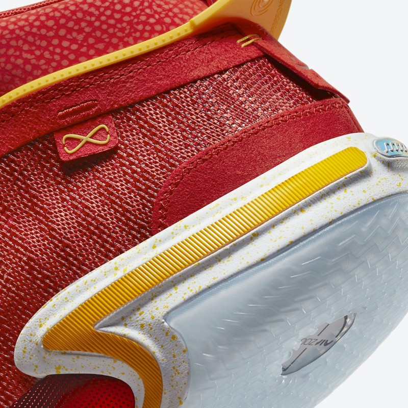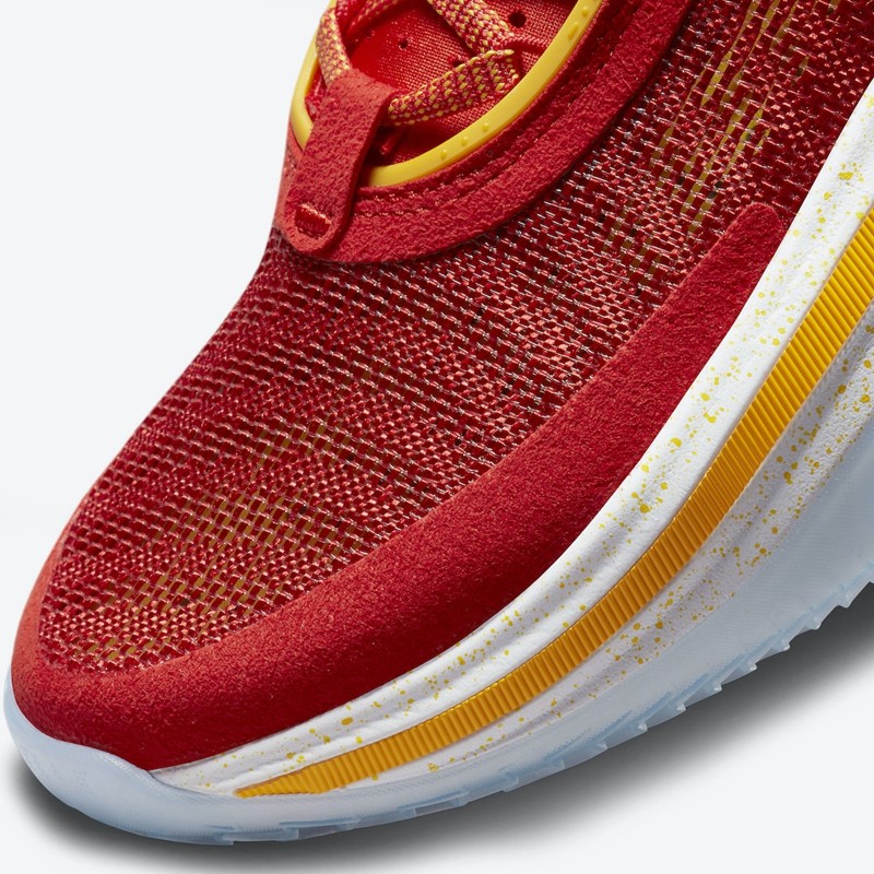 以郭艾伦 PE 配色为例,整双鞋采用了红色打造,细节处点缀亮黄色造型,虽然没有了传统的湖绿色,但红黄造型能够更好的致敬国旗颜色。