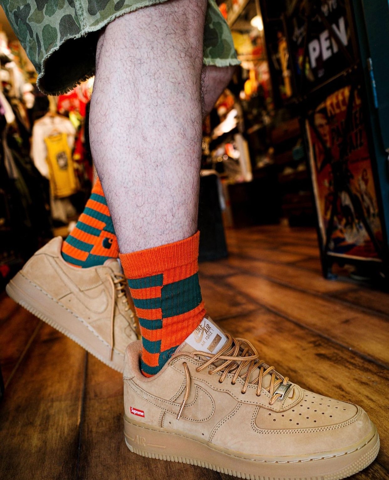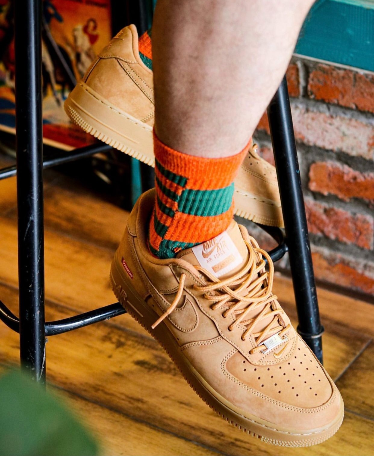 几年前小麦 Air Force 1 诞生之后直接成为超高人气配色,这双 Supreme 联名就在此基础上略作改动。