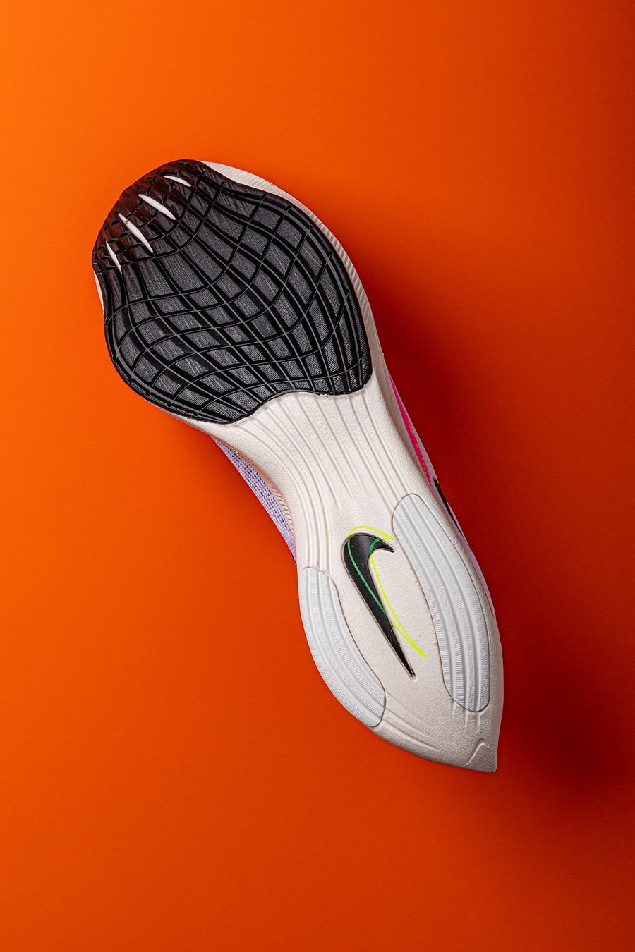 中底科技依然是全掌 ZoomX 泡棉 + 铲型碳板,提供充分回弹缓震及向前推动力。