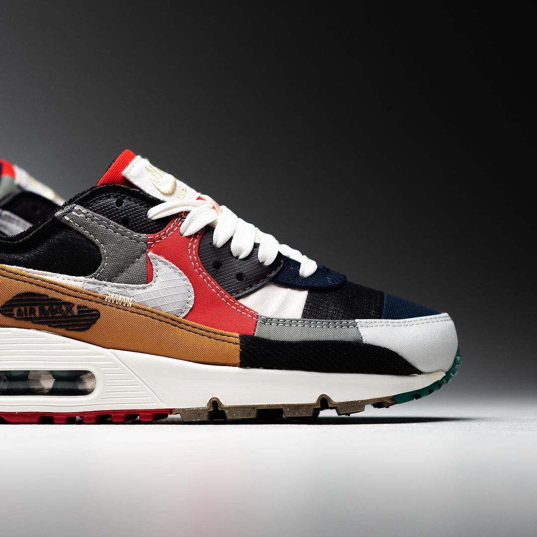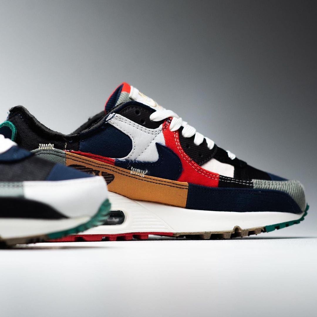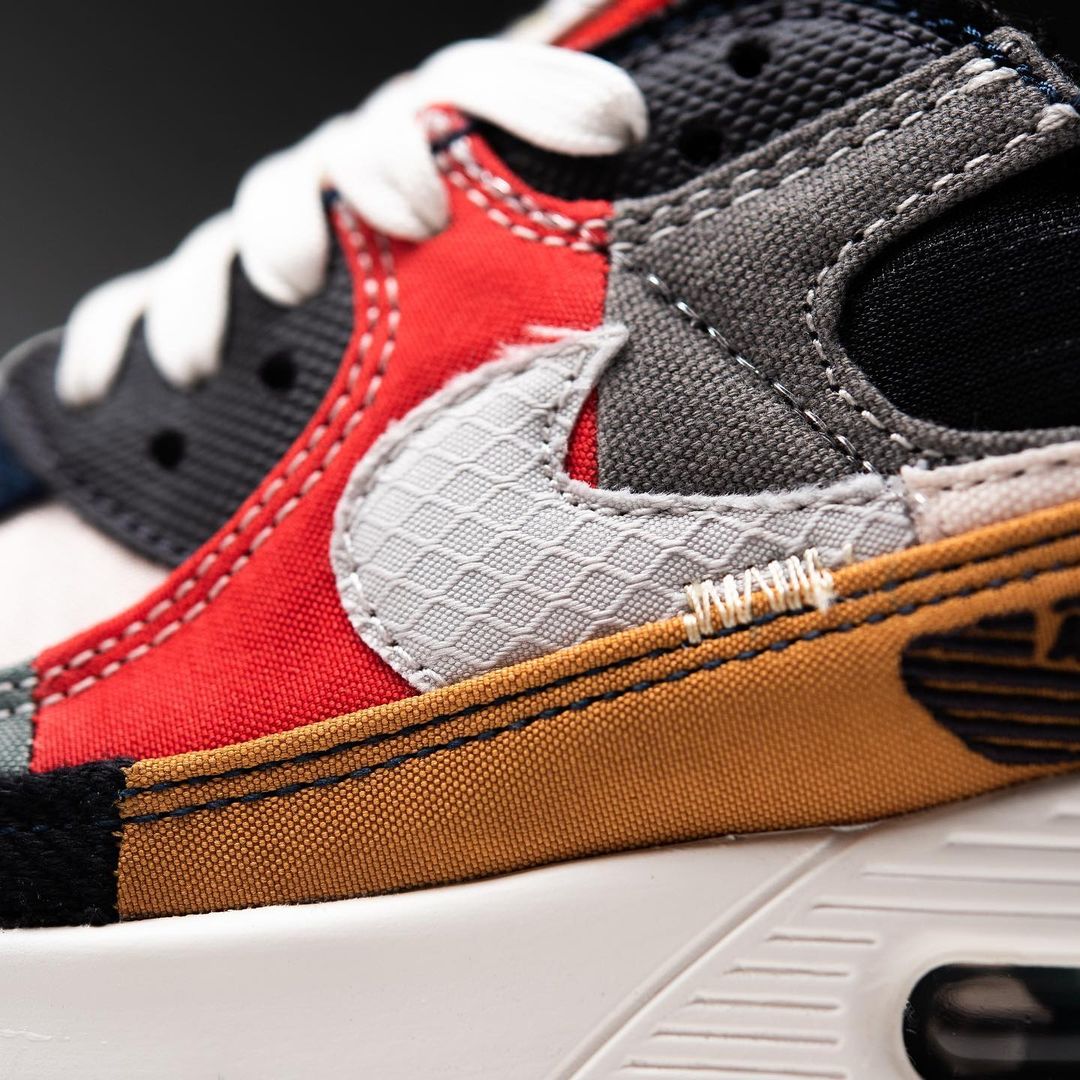 全新的 Air Max 90 采用了包括灯芯绒、翻毛皮、尼龙、帆布等超多材质拼接而成,也呈现出了极富解构美学的个性鞋款。