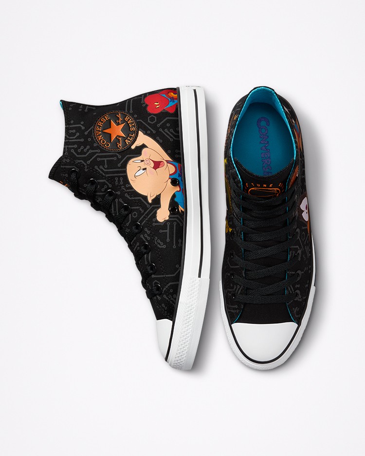 第三款 Chuck Taylor All Star 以黑色为主色,鞋身两侧印有电影中的卡通明星,使鞋面格外生动。