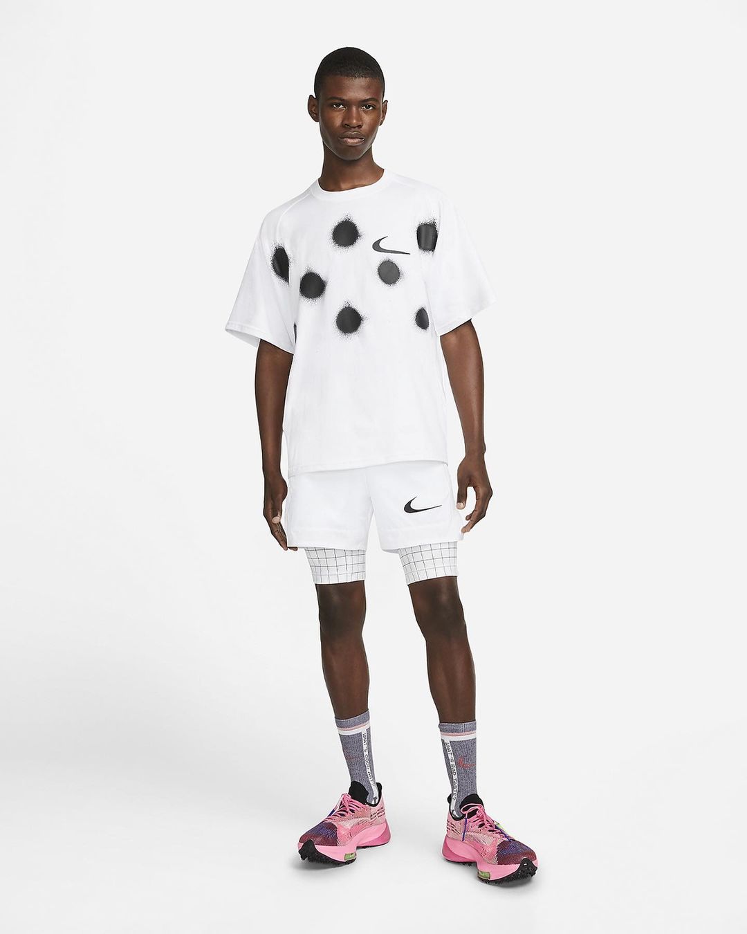服饰方面设计风格与去年春季单品相似,涂鸦式的泼墨 Swoosh Logo 和圆形点缀彰显出双方联名的独特之处。