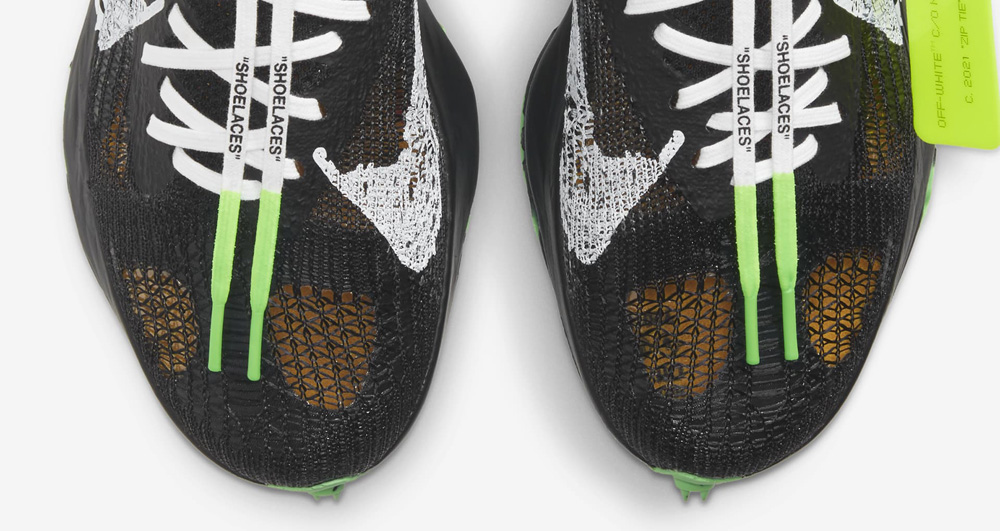 特殊的编织鞋面在鞋头部位有单层圆形镂空设计,鞋身内侧的文字标语、中底的 "AIR" 字符、鞋带和防盗扣等细节都是 OFF-WHITE 的经典操作。