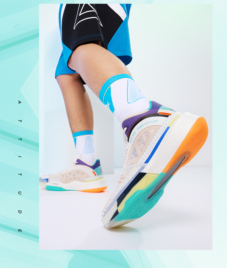 鞋身以白色为主体,搭配多种彩色几何线条点缀,颇具现代艺术气息,同时融入奥运五环的色调。