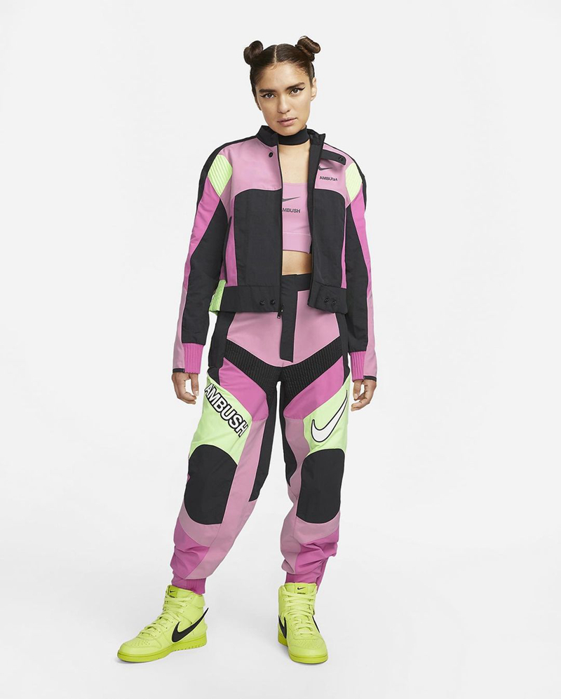 鞋身采用荧光绿覆盖,侧面黑色大号 Swoosh 延伸至后跟边缘,彰显 AMBUSH 联名身份。