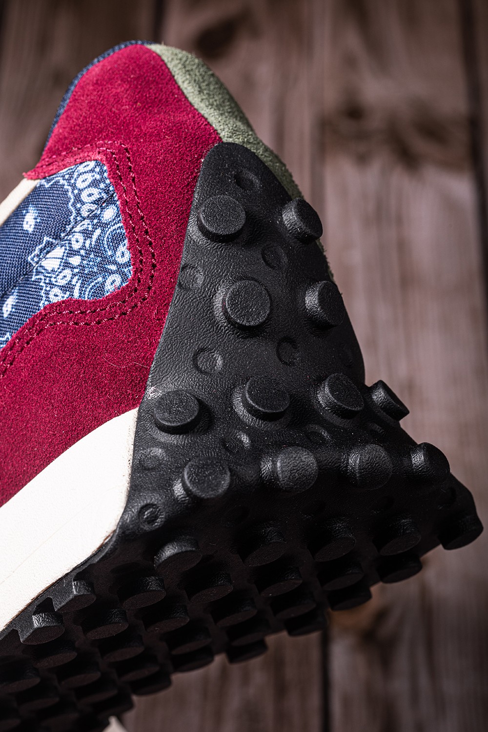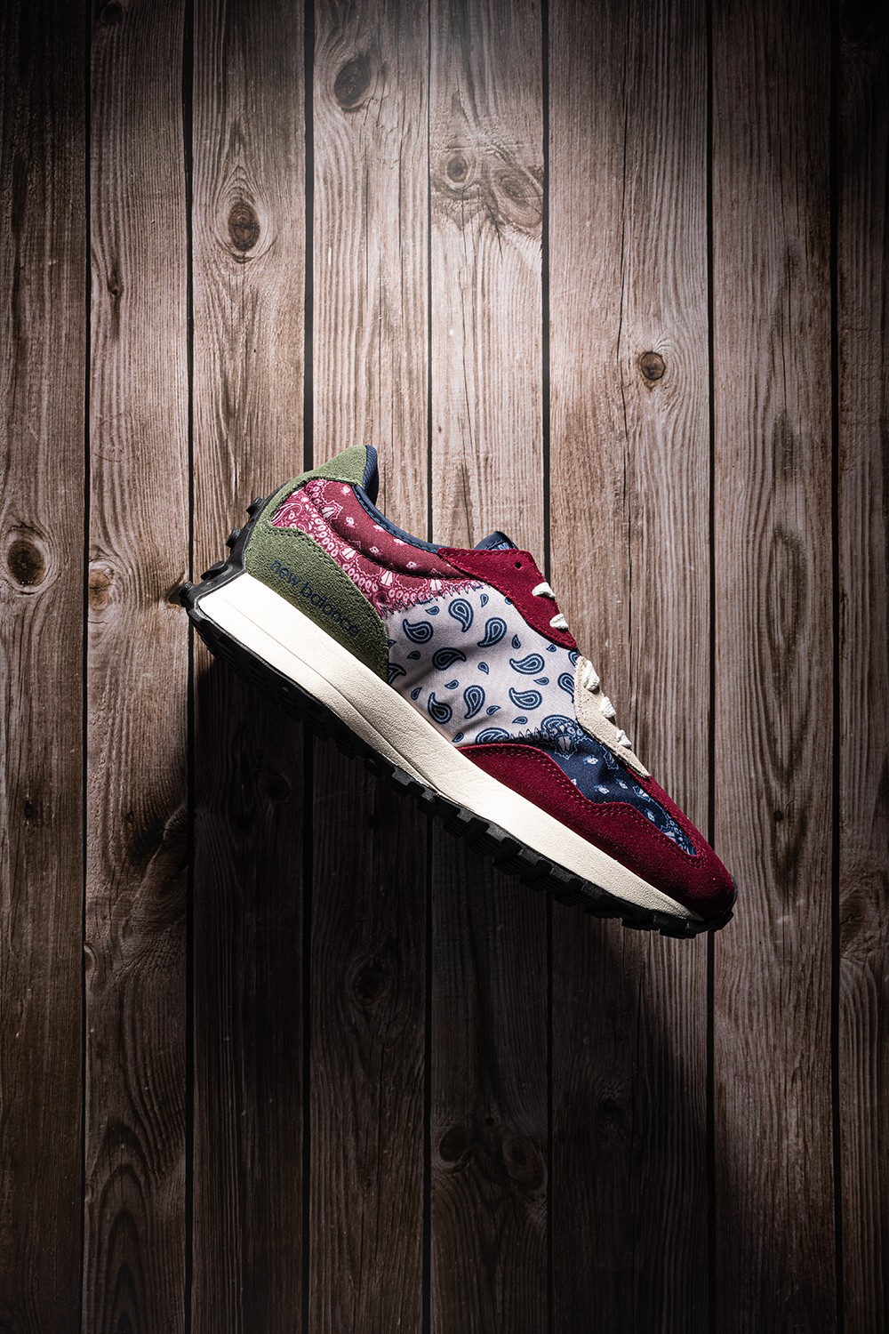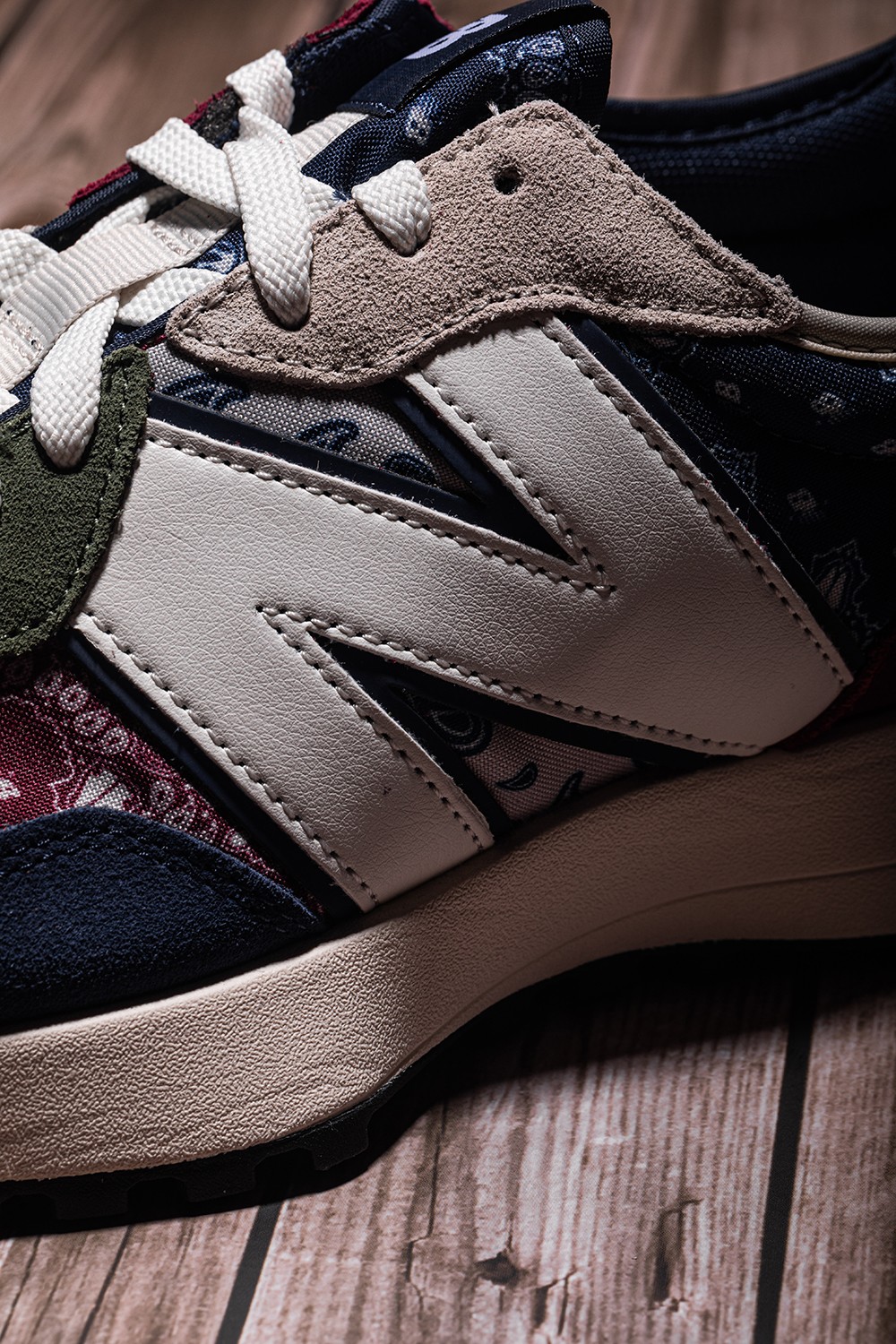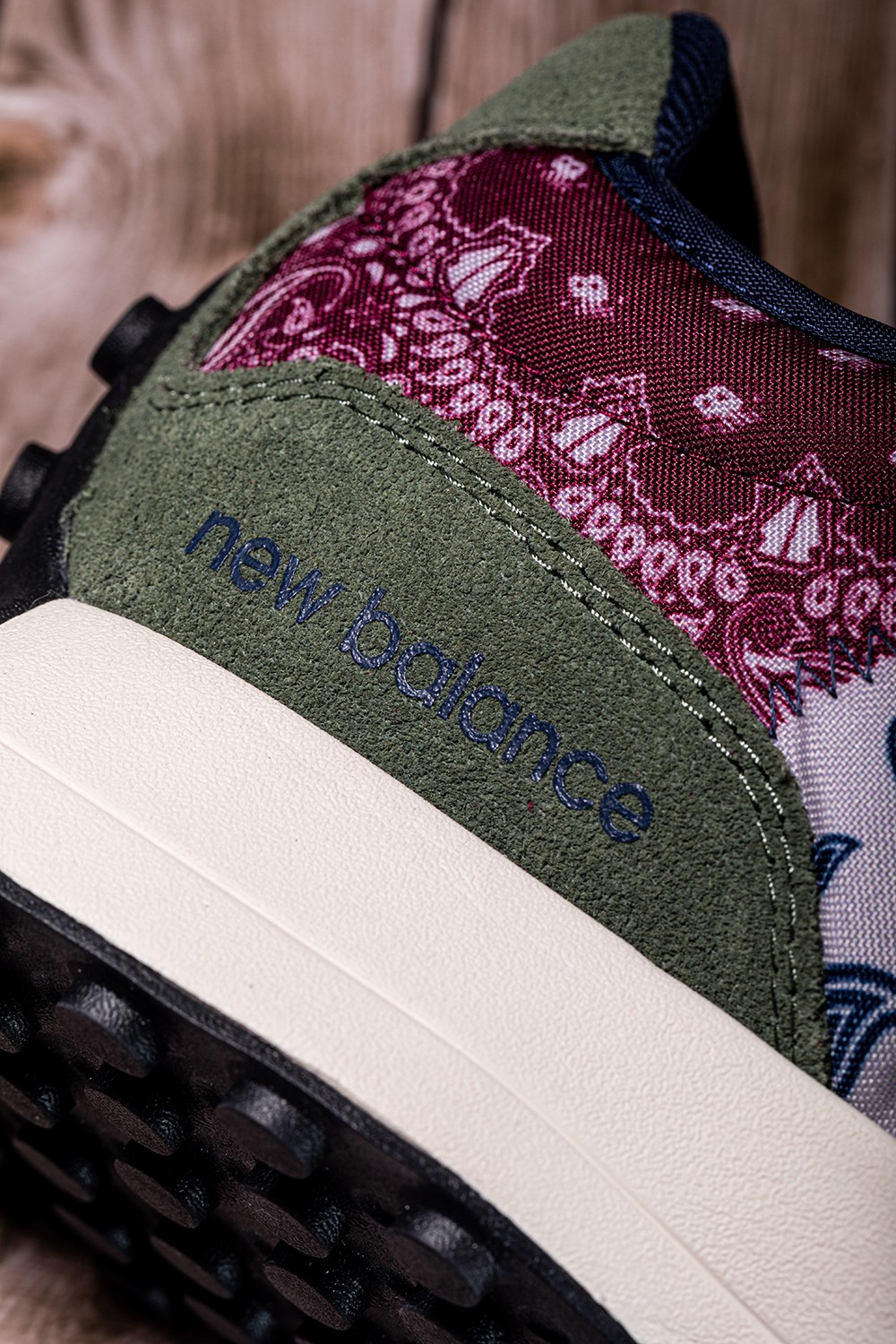 整双鞋承袭 New Balance 327 的复古腔调,深红色、海军蓝辅以军绿色点缀,完成整双鞋的构色。